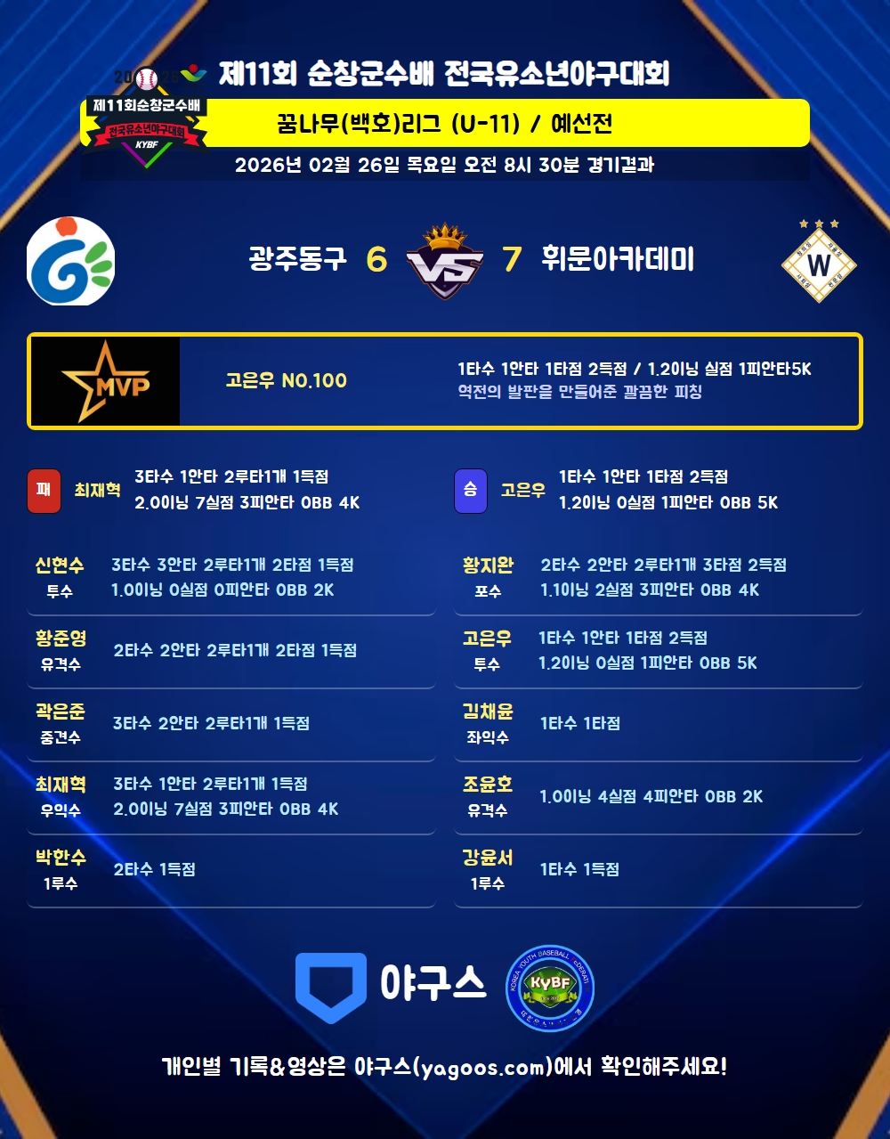 | 3 | 고은우(100) | 승 | 1.2 | 7 | 7 | 1 | - | - | 5 | 28 | - | - | 0 |