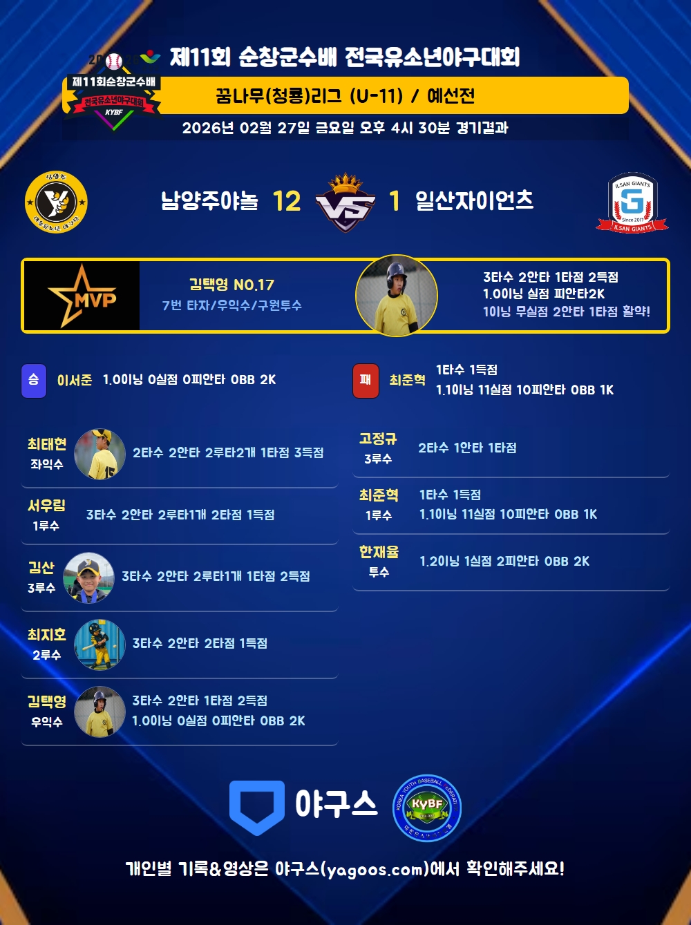 | 2루타 | 서우림(99) 최태현(15) 김산(8) 문시우(3) |
