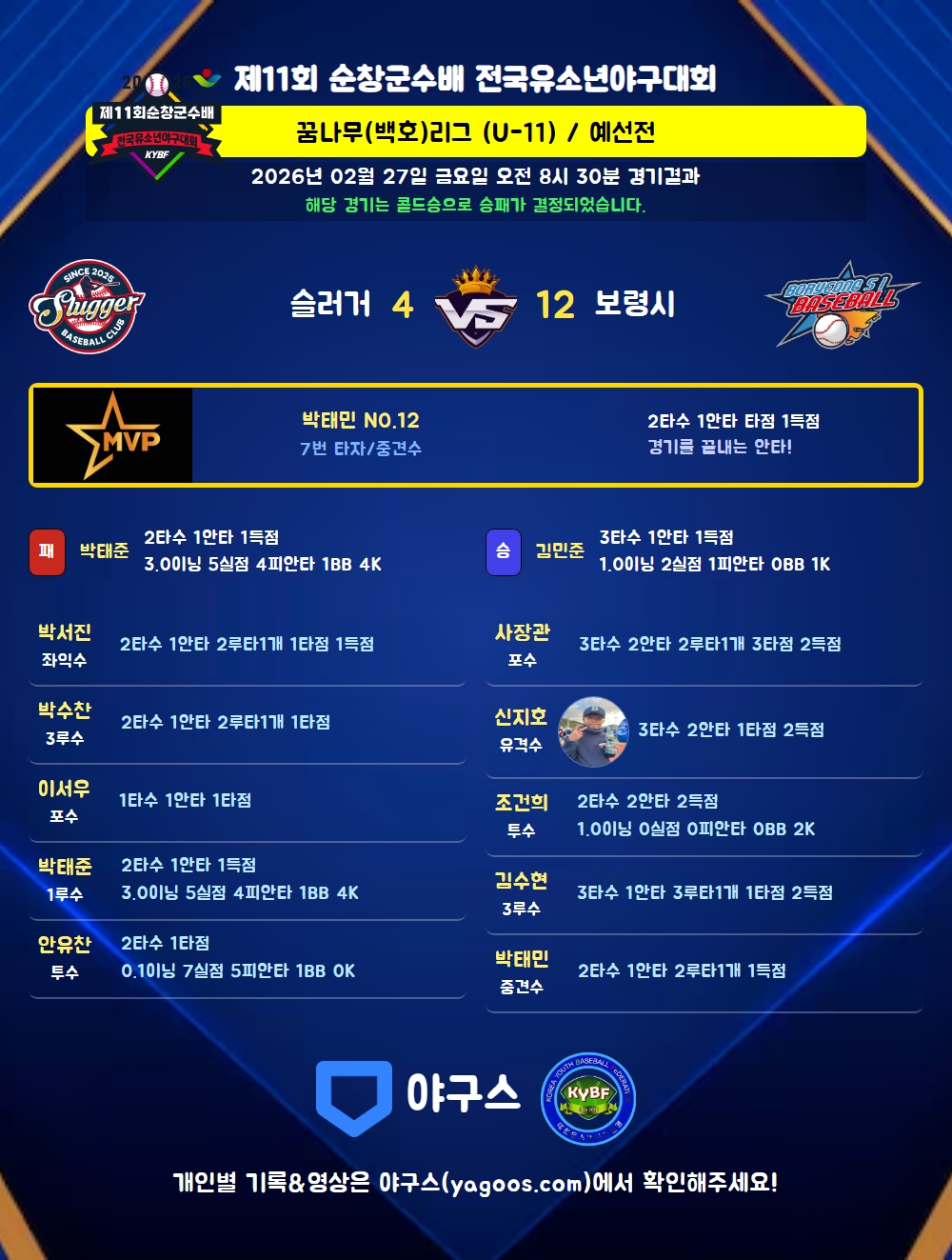 | 2루타 | 박서진(10) 박수찬(11) 사장관(8) 박태민(12) |