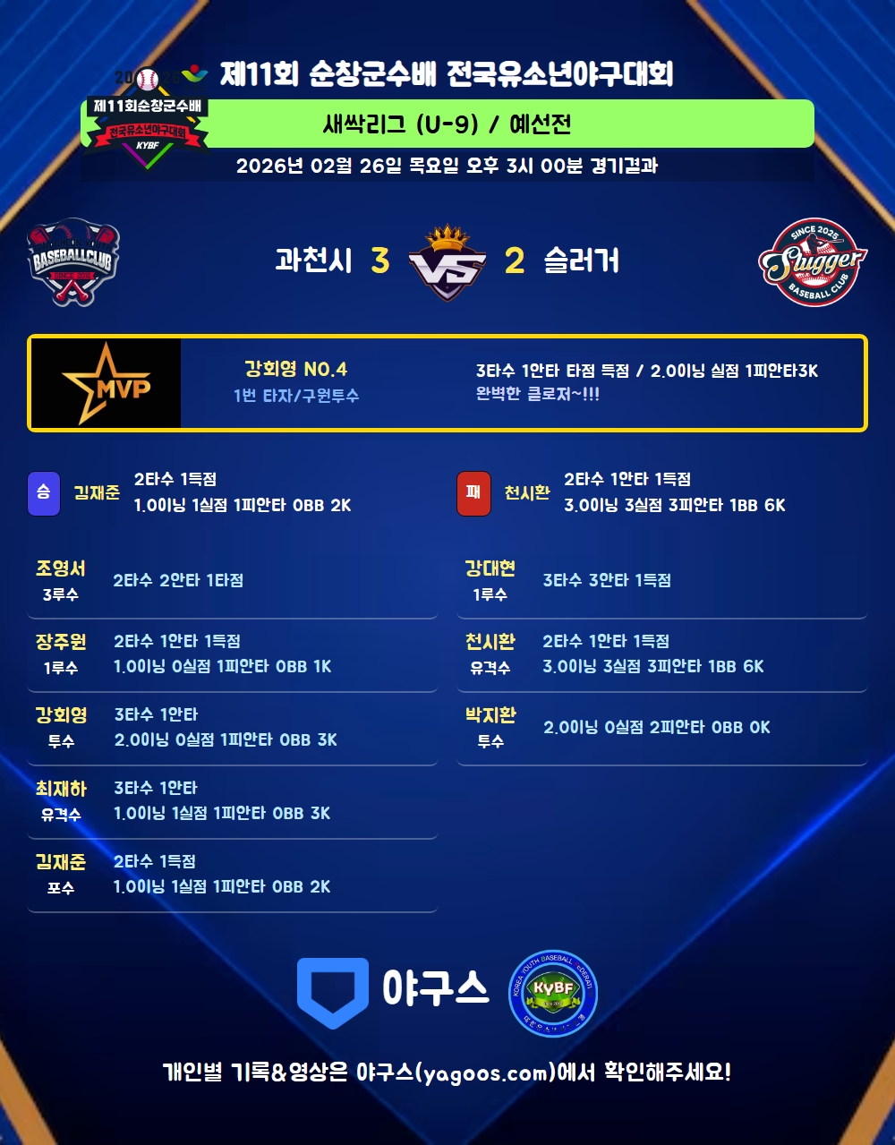 | 3 | 유 | 최재하(8) | 투땅 | - | 2내안 | - | 유직병살 | - | 3 | 1 | - | - | - | - | - | - | 0.333 |