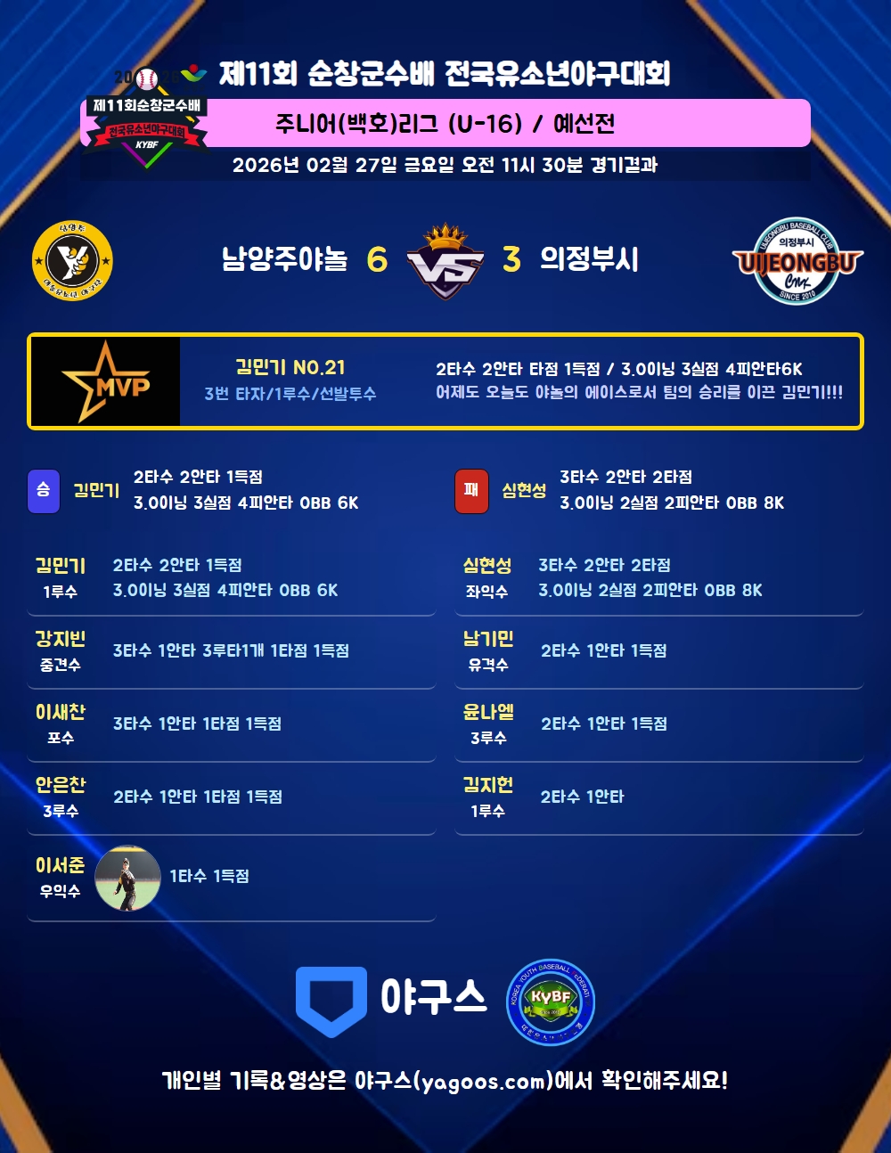 | 1 | 김민기(21) | 승 | 3.0 | 14 | 13 | 4 | - | 1 | 6 | 58 | 3 | 3 | 9.00 |