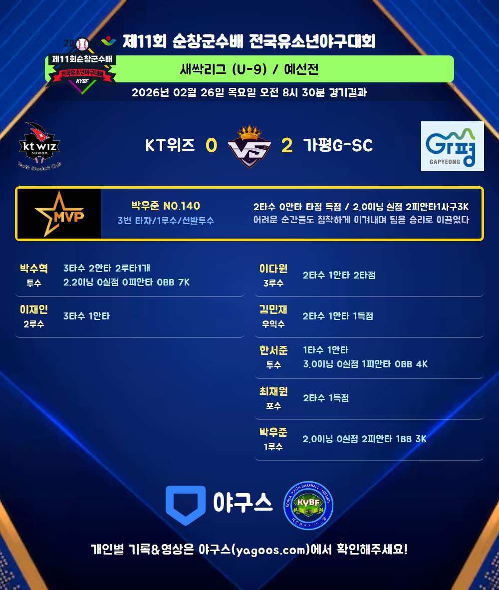 | 1 | 박우준(140) | 승 | 2.0 | 10 | 8 | 2 | - | 2 | 3 | 39 | - | - | 0 |