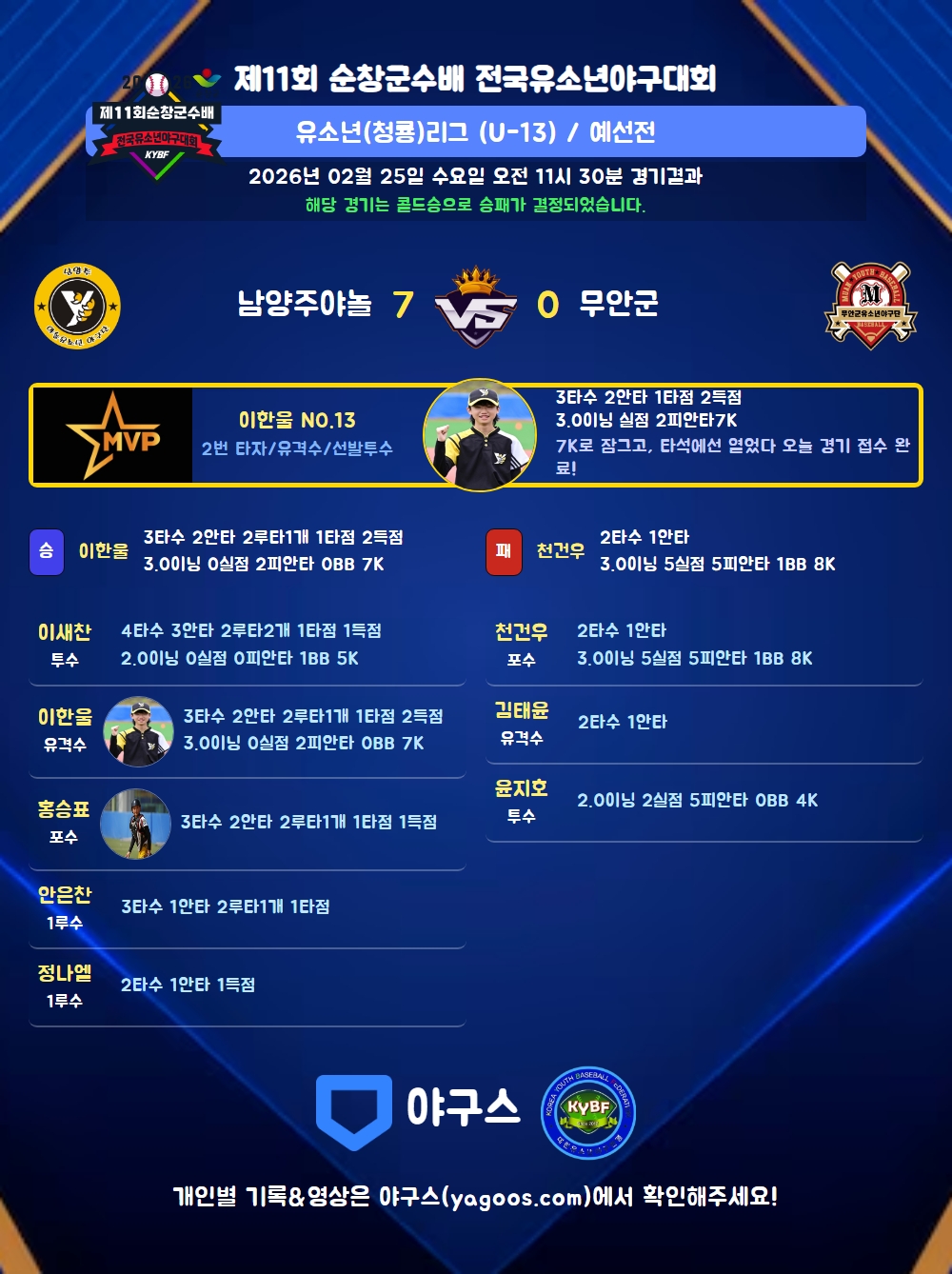 | 1 | 이한울(13) | 승 | 3.0 | 11 | 11 | 2 | - | - | 7 | 46 | - | - | 0 |