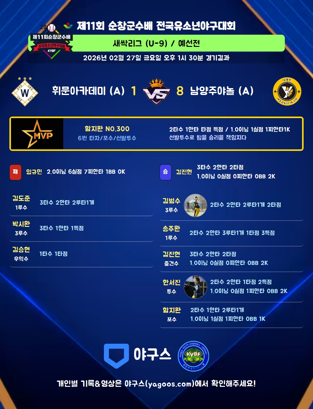 | 2루타 | 김도준(510) 김범수(32) 함지환(300) |