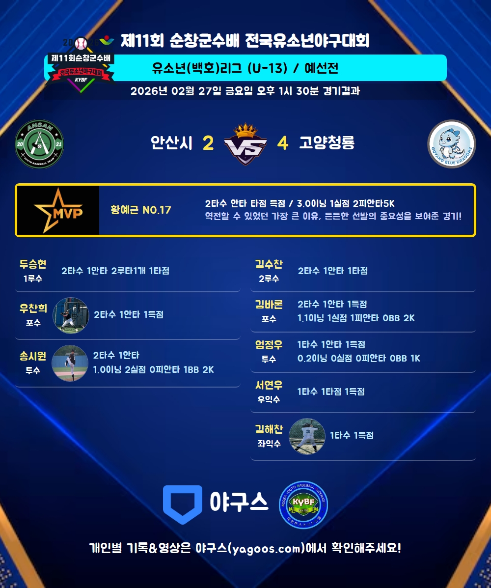 | 4 | 포 | 우찬희(98) | - | 1내안 | - | 삼진 | - | 2 | 1 | - | 1 | - | - | - | 1 | 0.500 |