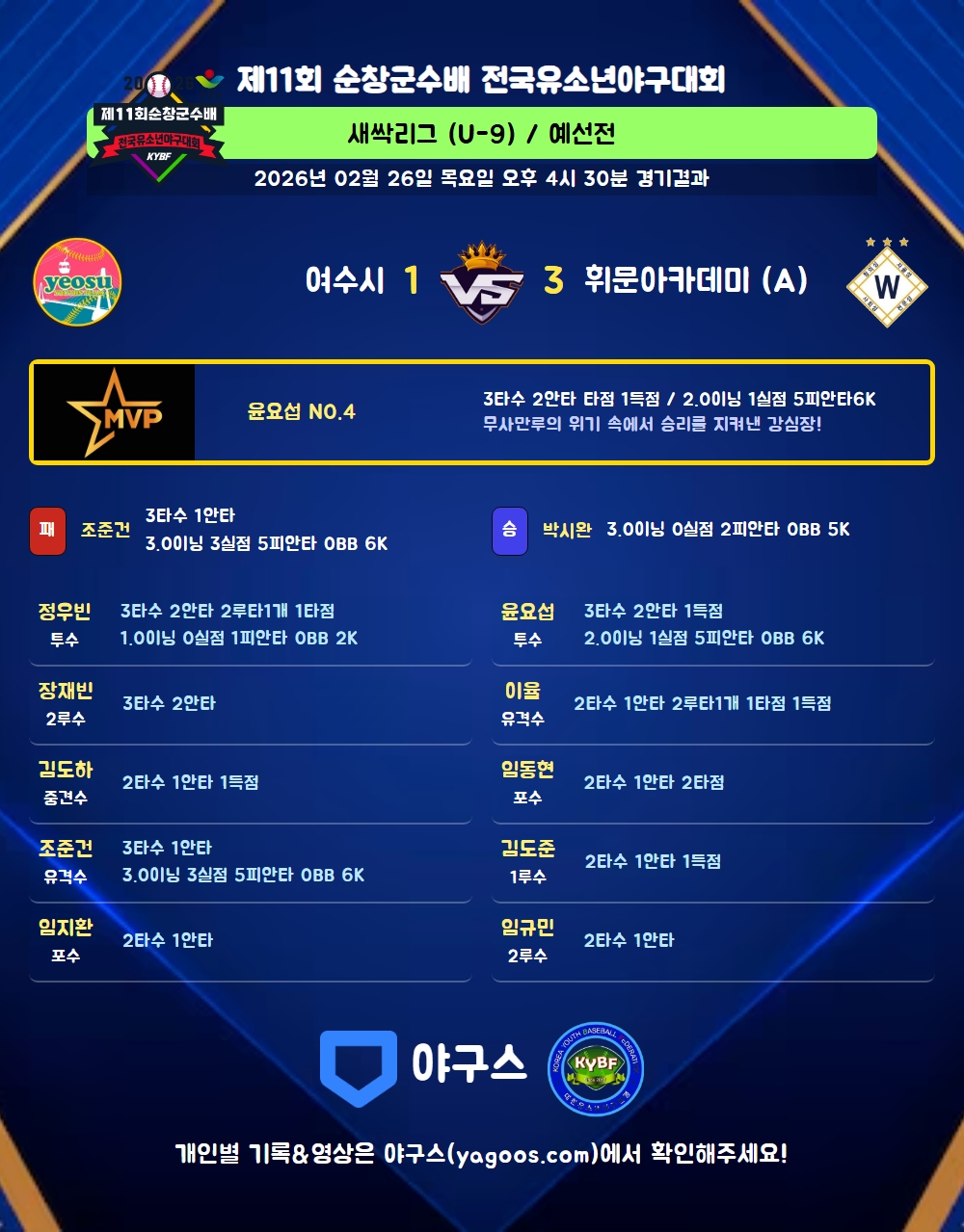| 1 | 유 | 조준건(26) | 투땅 | - | 우플 | - | 3내안 | 3 | 1 | - | - | - | - | - | - | 0.333 |