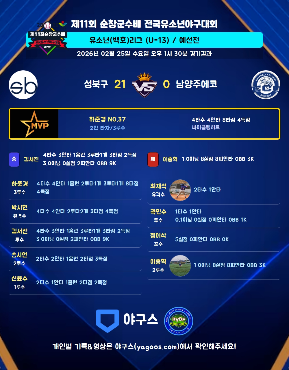 | 홈런 | 하준경(37) 김서진(7) 신윤수(30) 송시언(66) |