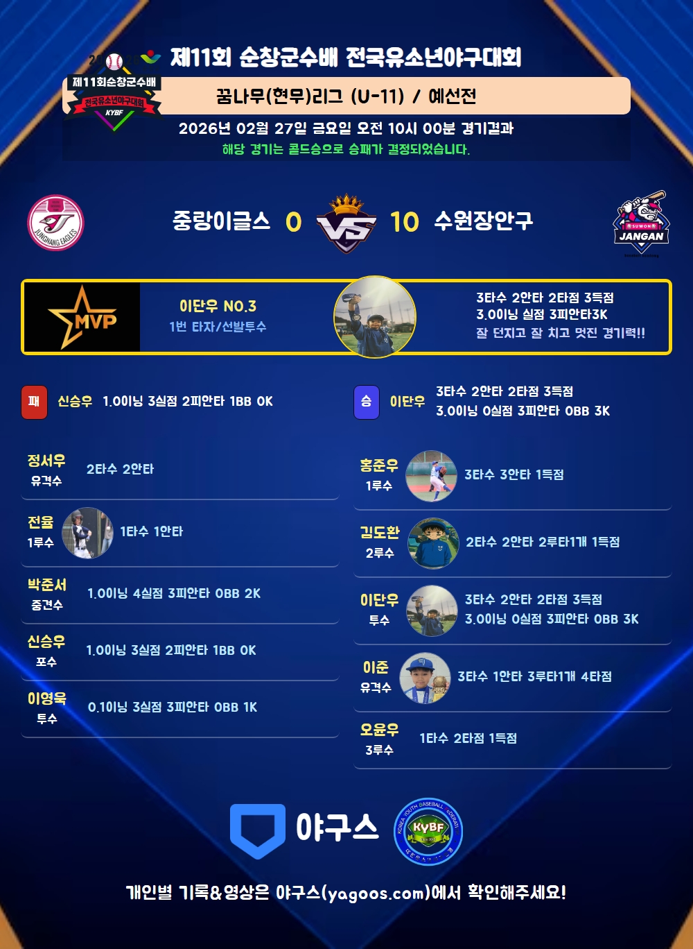 | 중랑이글스 | 0 | 0 | 0 | 0 | 3 | 0 | 1 | 3 |
