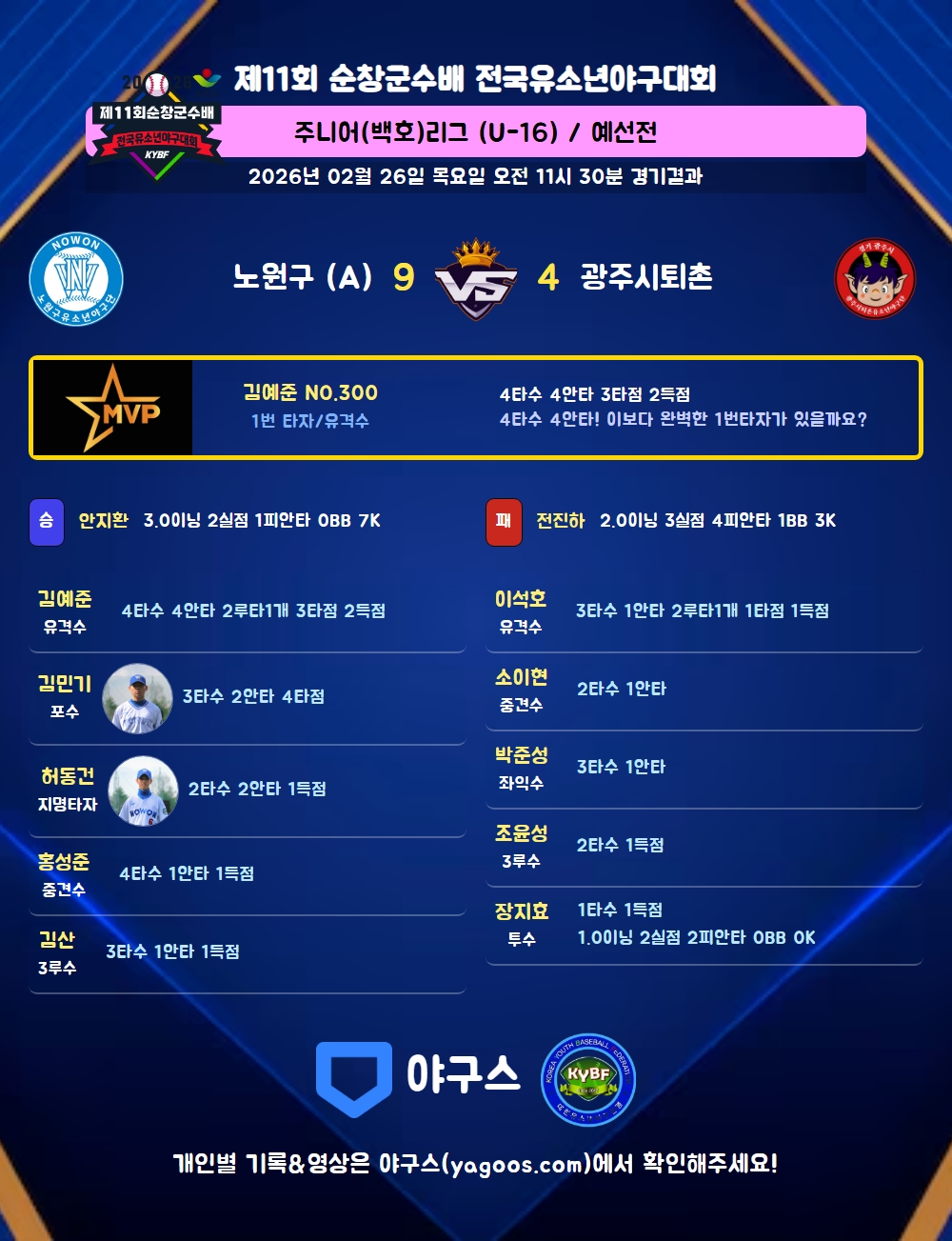 | 1 | 유 | 김예준(300) | 좌안 | 좌안(1타점) | - | 좌안 | 좌선2(2타점) | - | 4 | 4 | 3 | 2 | - | 3 | - | - | 1.000 |