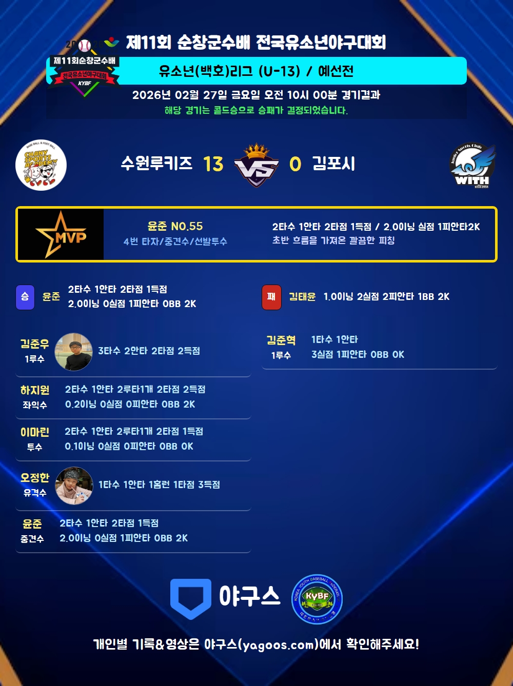 | 수원루키즈 | 2 | 0 | 11 | 0 | 13 | 8 | 0 | 7 | 2 |