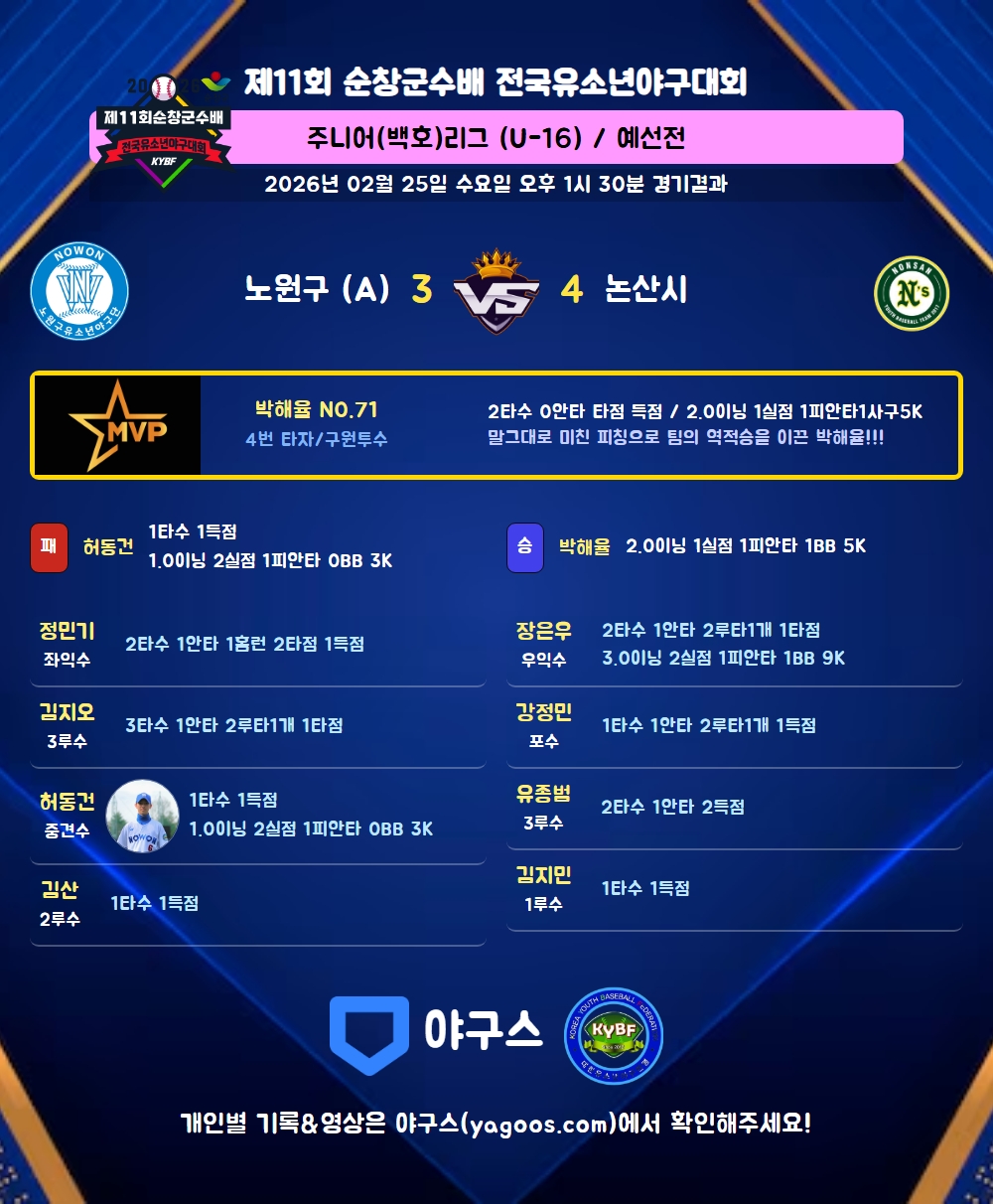 | 2 | 박해율(71) | 승 | 2.0 | 9 | 8 | 1 | - | 1 | 5 | 40 | 1 | 1 | 4.50 |