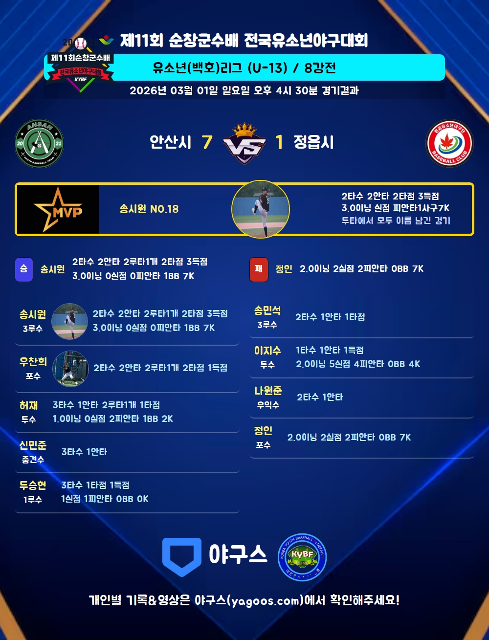 | 1 | 송시원(18) | 승 | 3.0 | 11 | 9 | - | - | 2 | 7 | 40 | - | - | 0 |