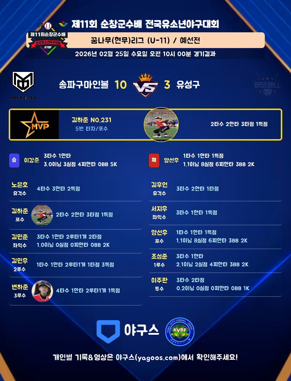 | 7 | 좌 | 김민준(151) | 우전2(2타점) | - | 1땅 | - | 삼진 | - | 3 | 1 | 2 | - | - | - | - | 1 | 0.333 |