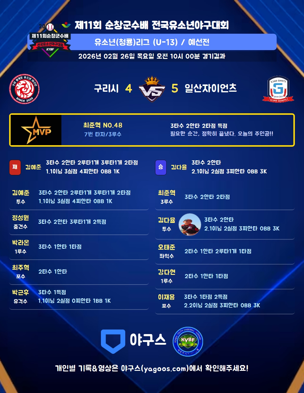| 3 | 투 | 김예준(99) | 좌중2(1타점) | - | 우중3(1타점) | - | 2플 | 3 | 2 | 2 | - | - | - | - | - | 0.667 |
