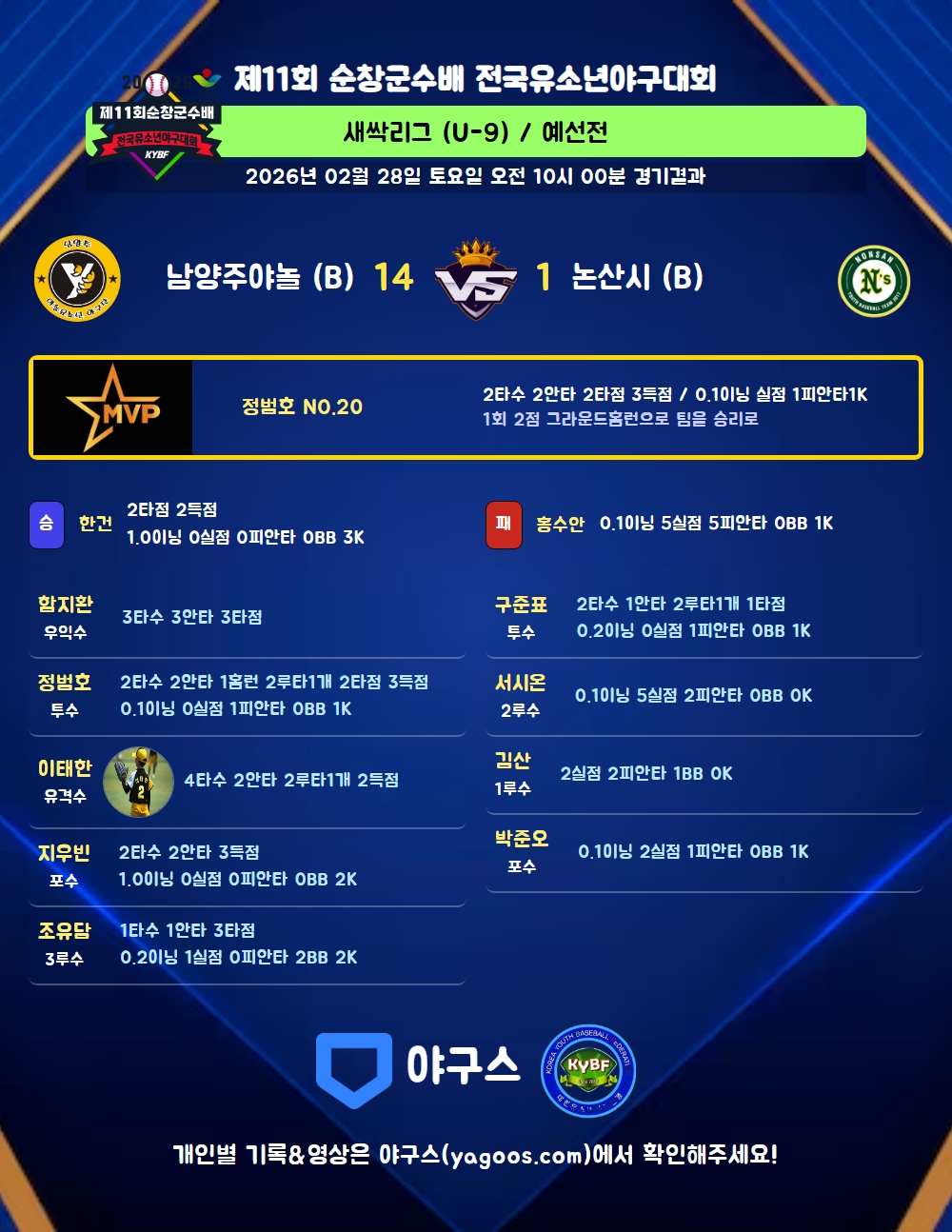 | 남양주야놀 (B) | 5 | 5 | 4 | 0 | 14 | 11 | 0 | 12 | 3 |