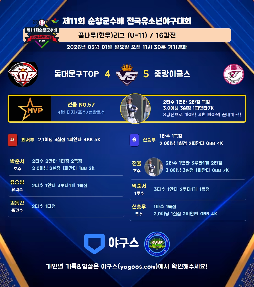 | 중랑이글스 | 2 | 0 | 0 | 0 | 3 | 5 | 2 | 0 | 8 | 3 |