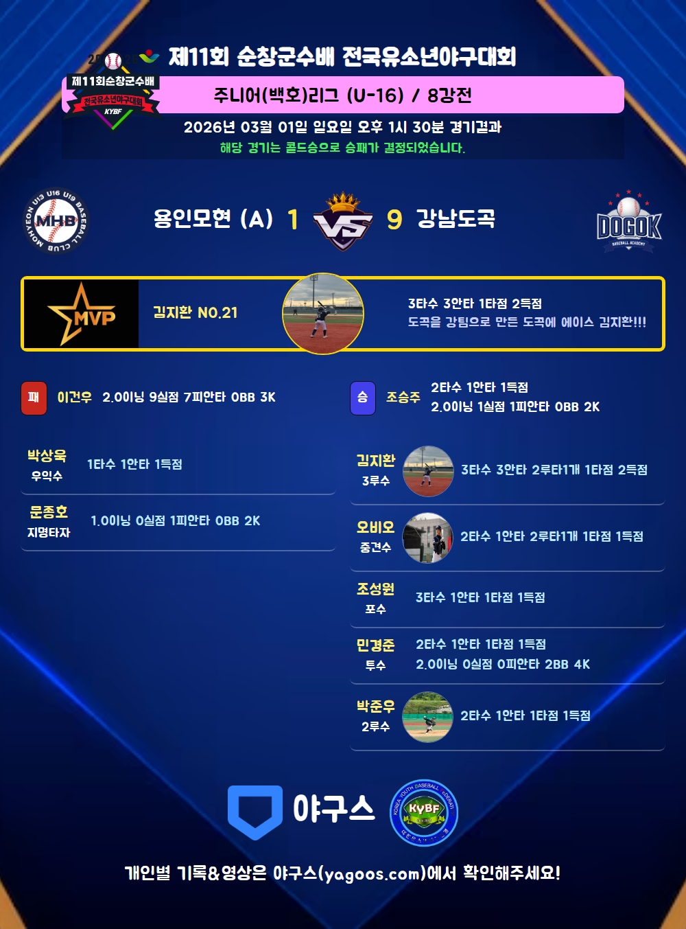 | 5 | 투 | 민경준(23) | 중안(1타점) | 2플 | - | - | 2 | 1 | 1 | 1 | - | 1 | - | - | 0.500 |