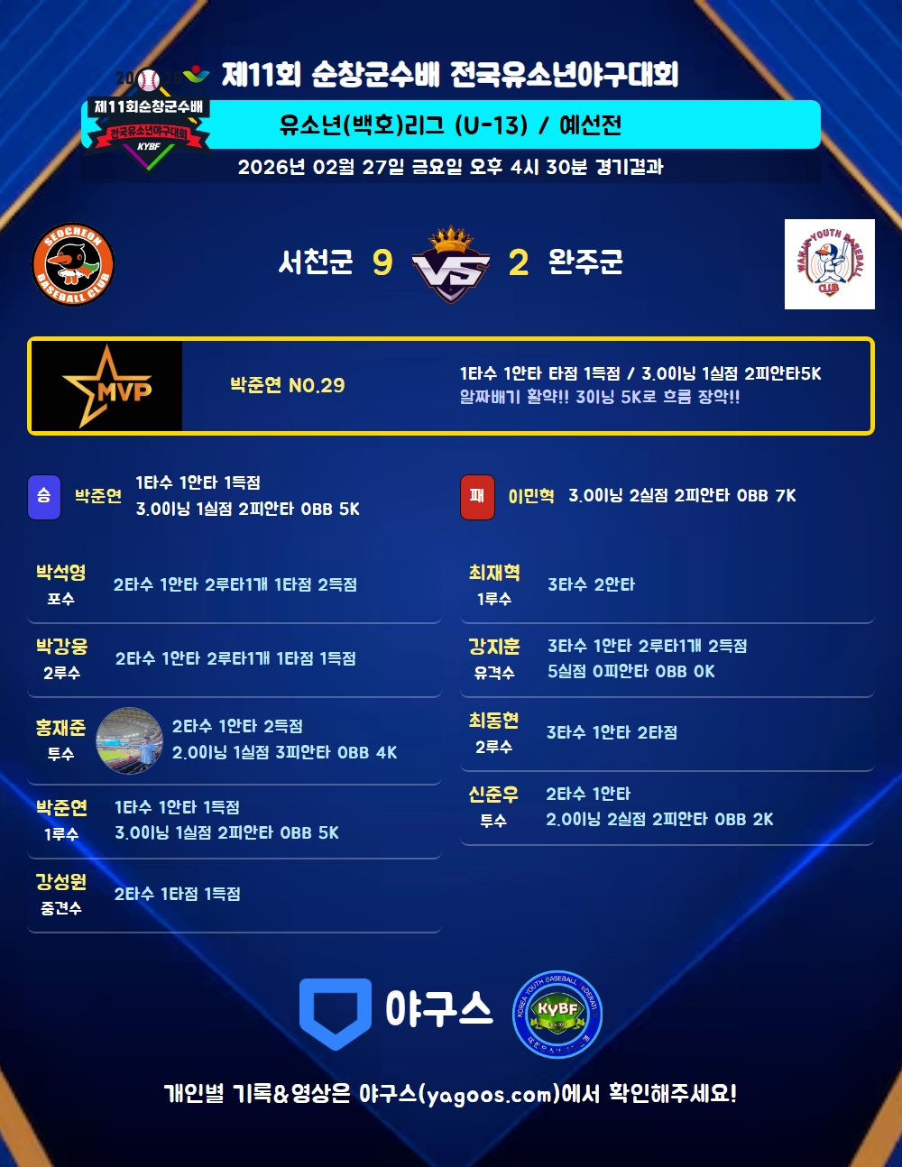 | 1 | 박준연(29) | 승 | 3.0 | 12 | 11 | 2 | - | 1 | 5 | 25 | 1 | - | 0 |
