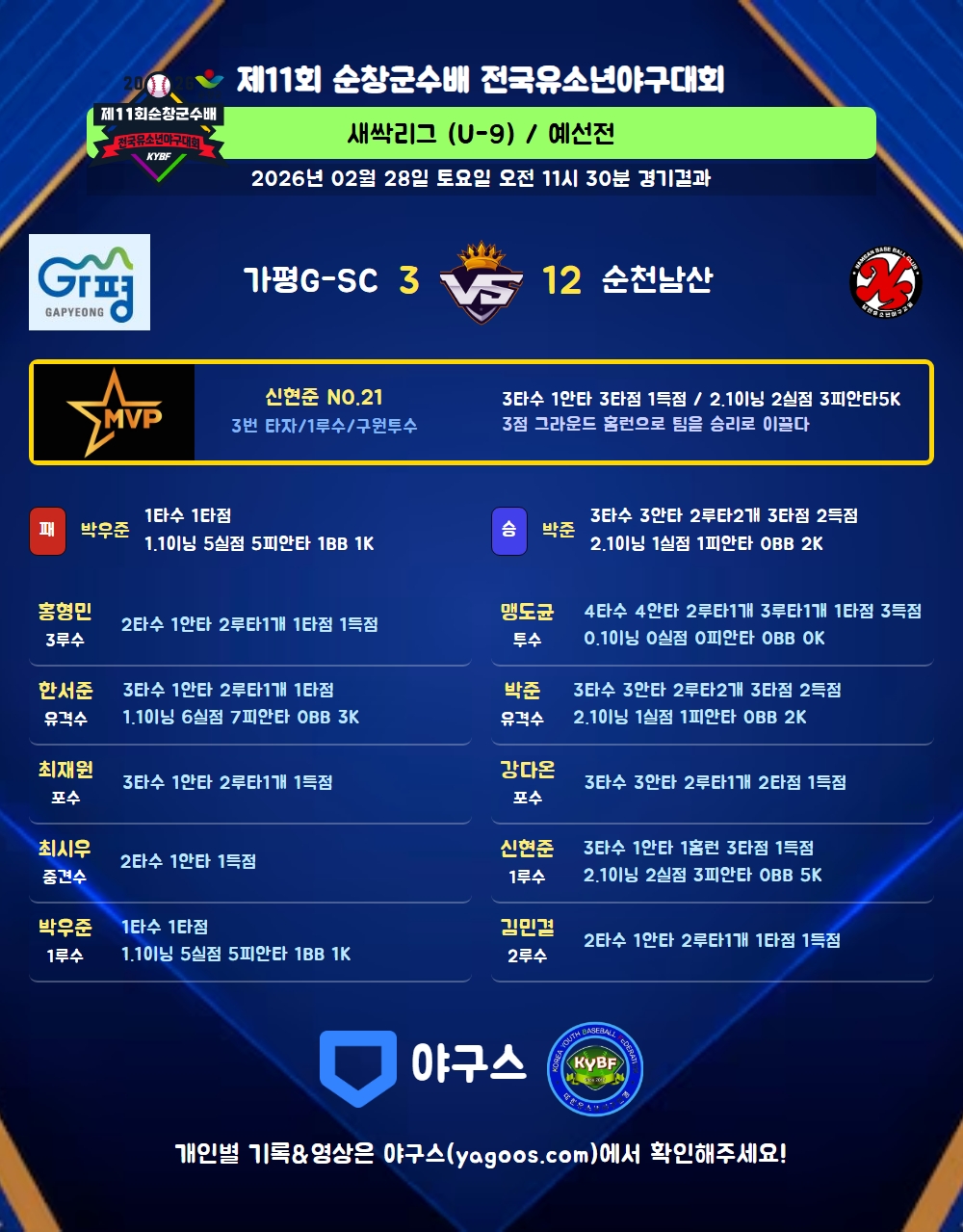 | 2루타 | 한서준(1) 최재원(15) 홍형민(7) 맹도균(6) 박준(47) 김민결(1) 강다온(15) 김민재(30) |