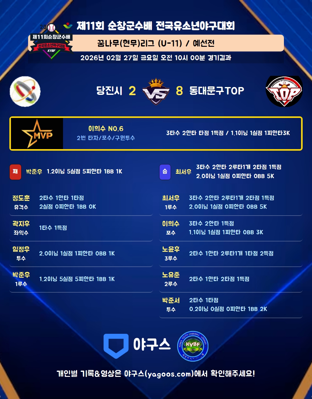 | 1 | 최서우(37) | 승 | 2.0 | 11 | 6 | - | - | 5 | 5 | 53 | 1 | 1 | 4.50 |