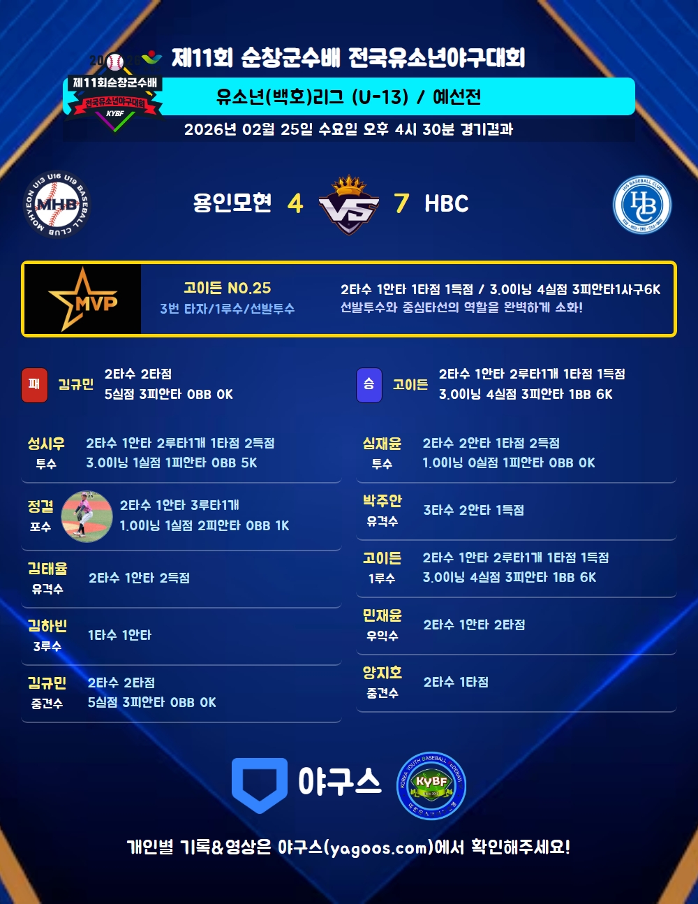 | 7 | 우 | 민재윤(51) | 우안(2타점) | - | 삼진 | - | - | 2 | 1 | 2 | - | - | - | - | 1 | 0.500 |