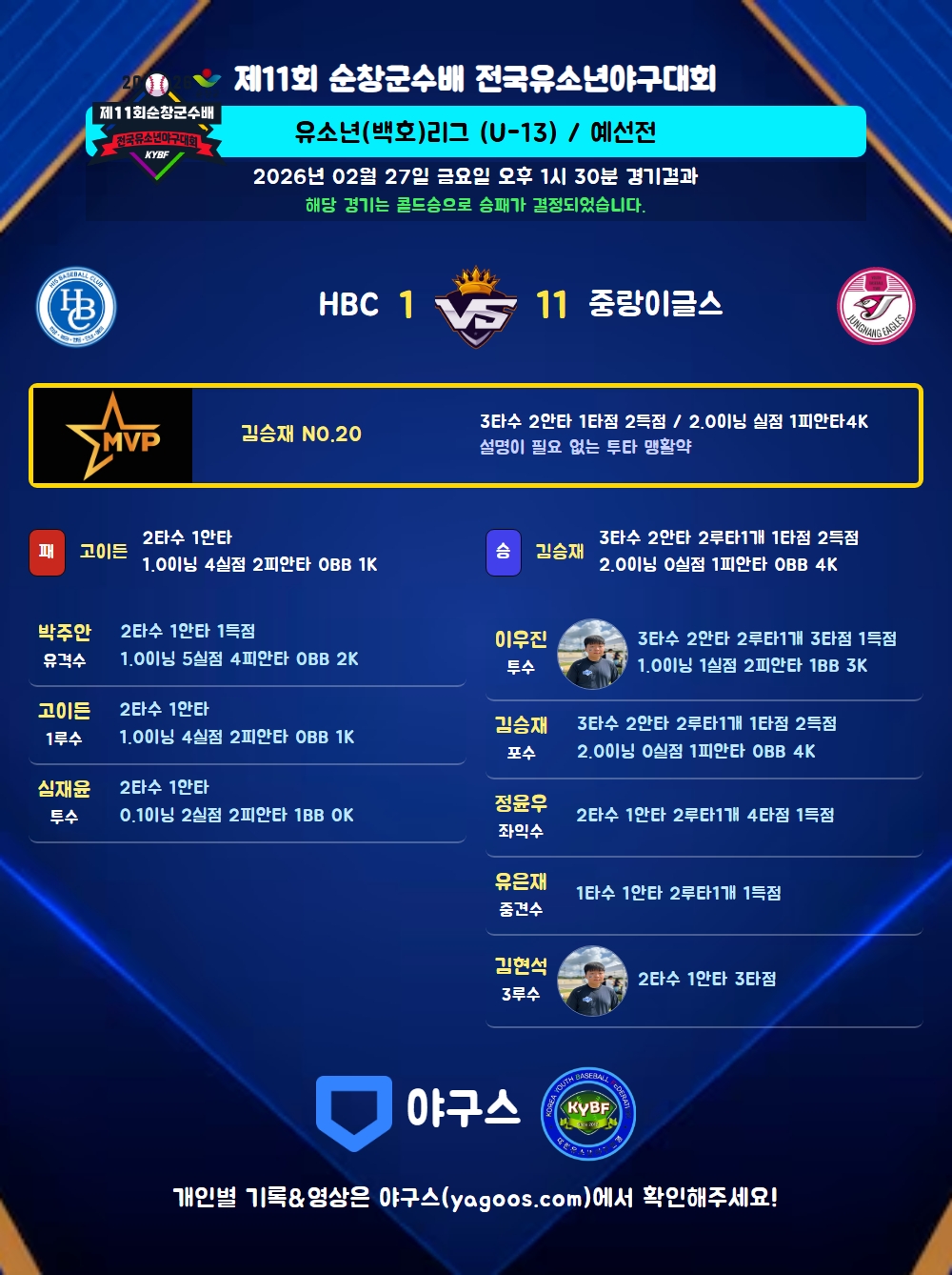 | 2루타 | 김승재(20) 이우진(85) 정윤우(22) 유은재(33) |