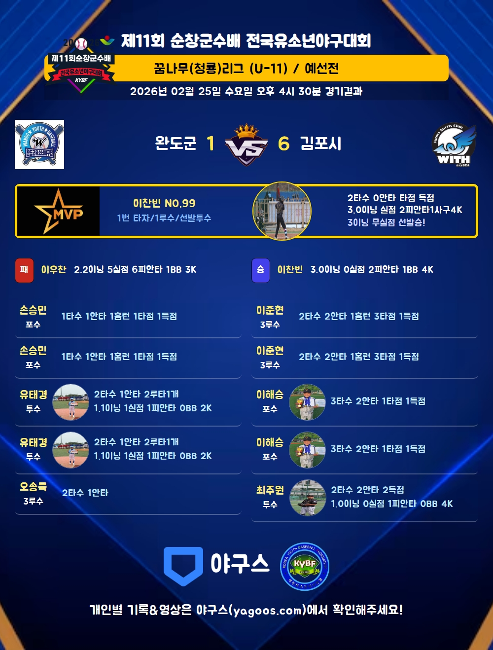 | 1 | 이찬빈(99) | 승 | 3.0 | 10 | 9 | 2 | - | 1 | 4 | 38 | - | - | 0 |