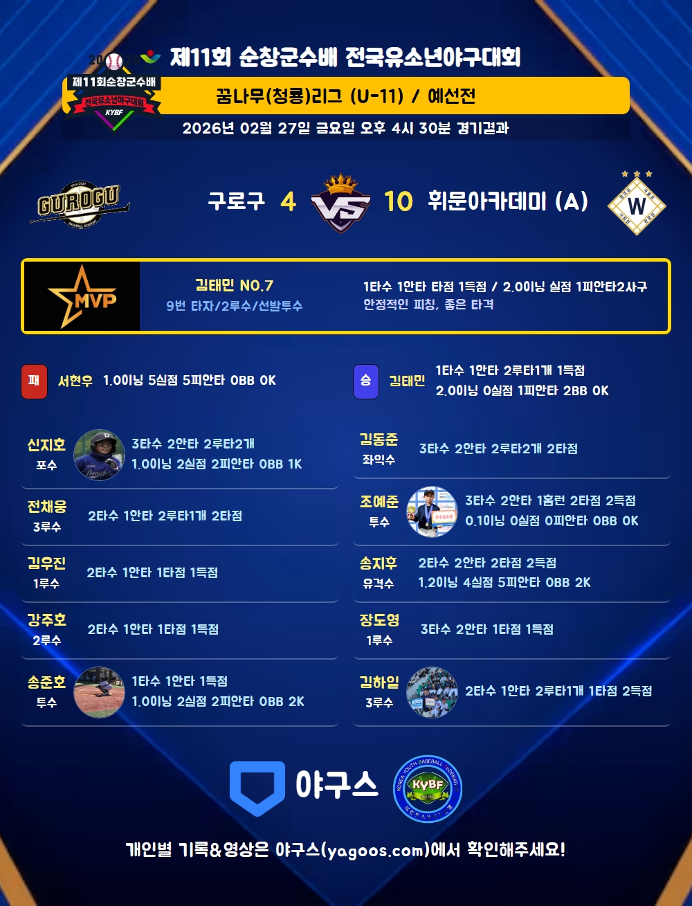| 2루타 | 신지호(100) 전채웅(99) 김윤준(29) 김하일(36) 김동준(500) 김태민(7) |