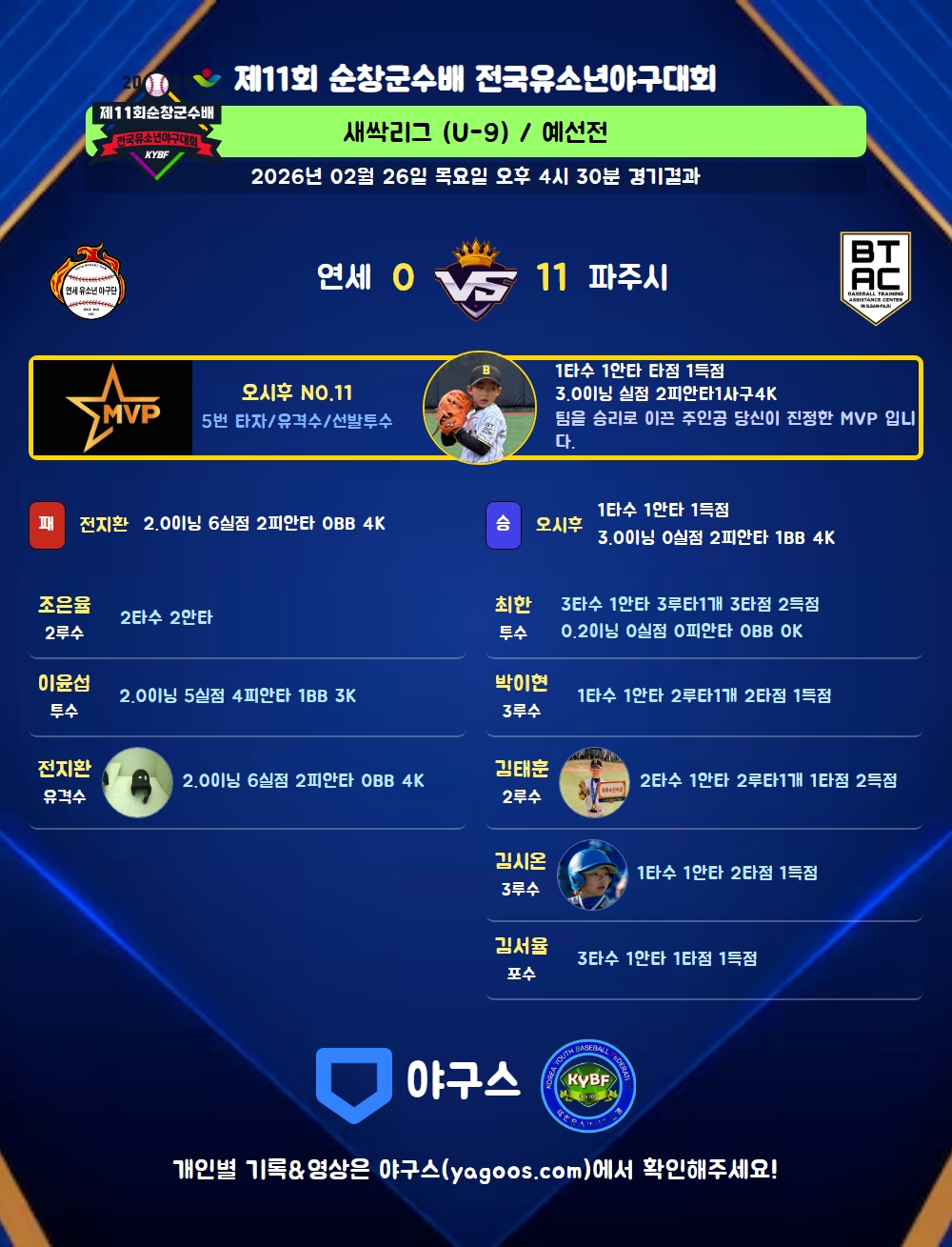 | 1 | 오시후(11) | 승 | 3.0 | 12 | 11 | 2 | - | 1 | 4 | 42 | - | - | 0 |