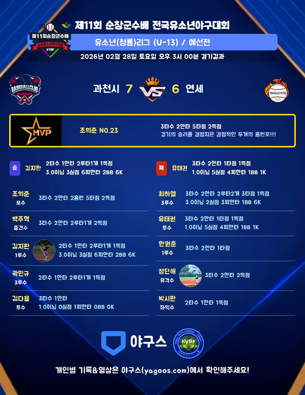 | 3 | 포 | 조희준(23) | 투땅출 | - | 우월홈(2타점) | 좌중홈(3타점) | - | 3 | 2 | 5 | 2 | 2 | 2 | - | - | 0.667 |