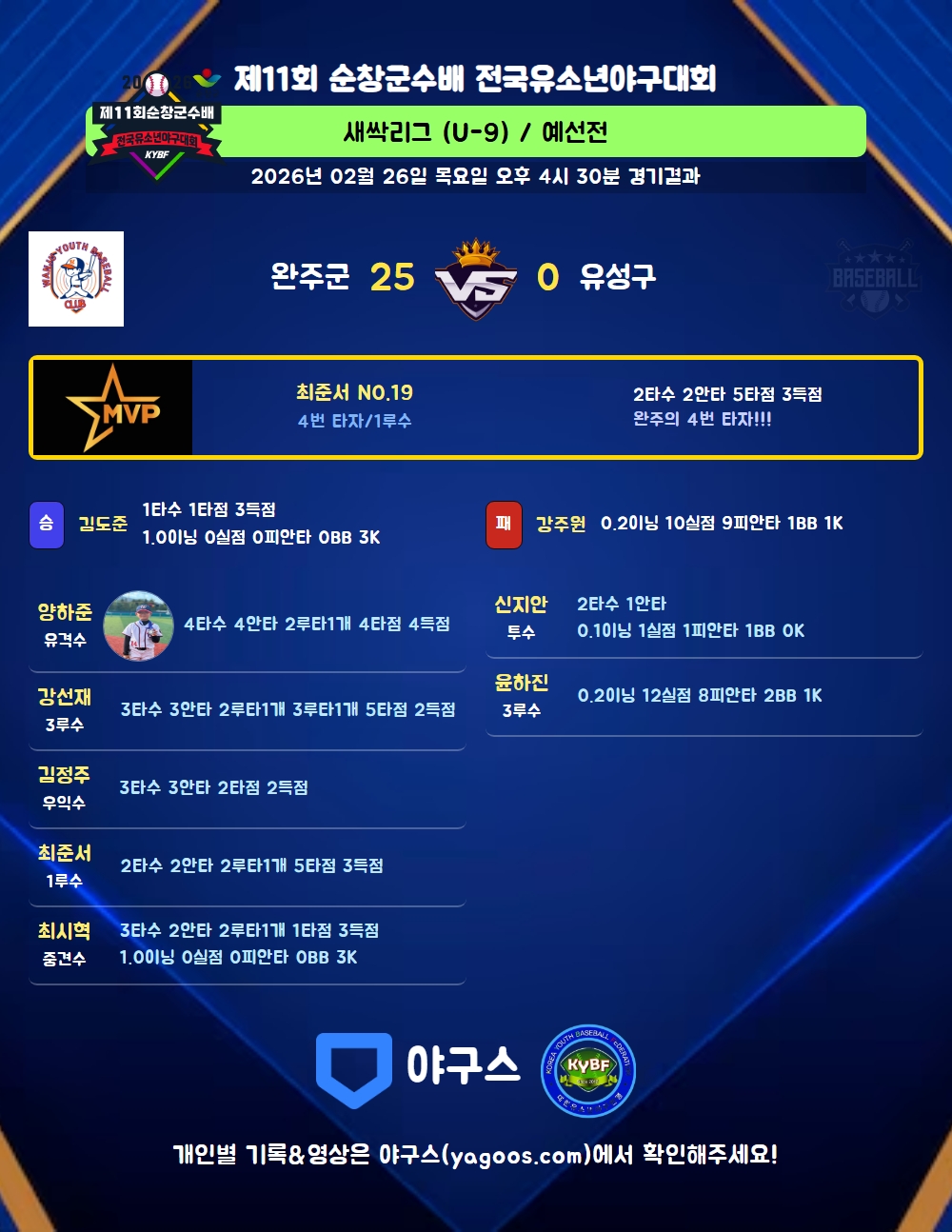 | 2루타 | 양하준(14) 최준서(19) 강선재(12) 최시혁(24) |
