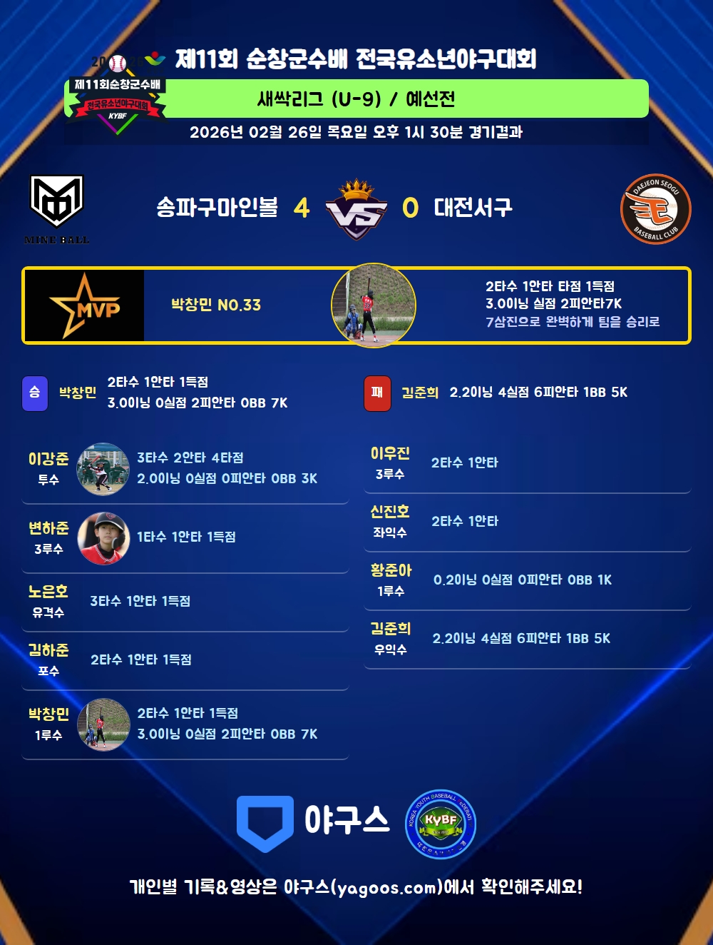 | 3 | 一 | 황준아(17) | 삼진 | - | 삼진 | - | - | - | 2 | 0 | - | - | - | - | - | 2 | 0.000 |