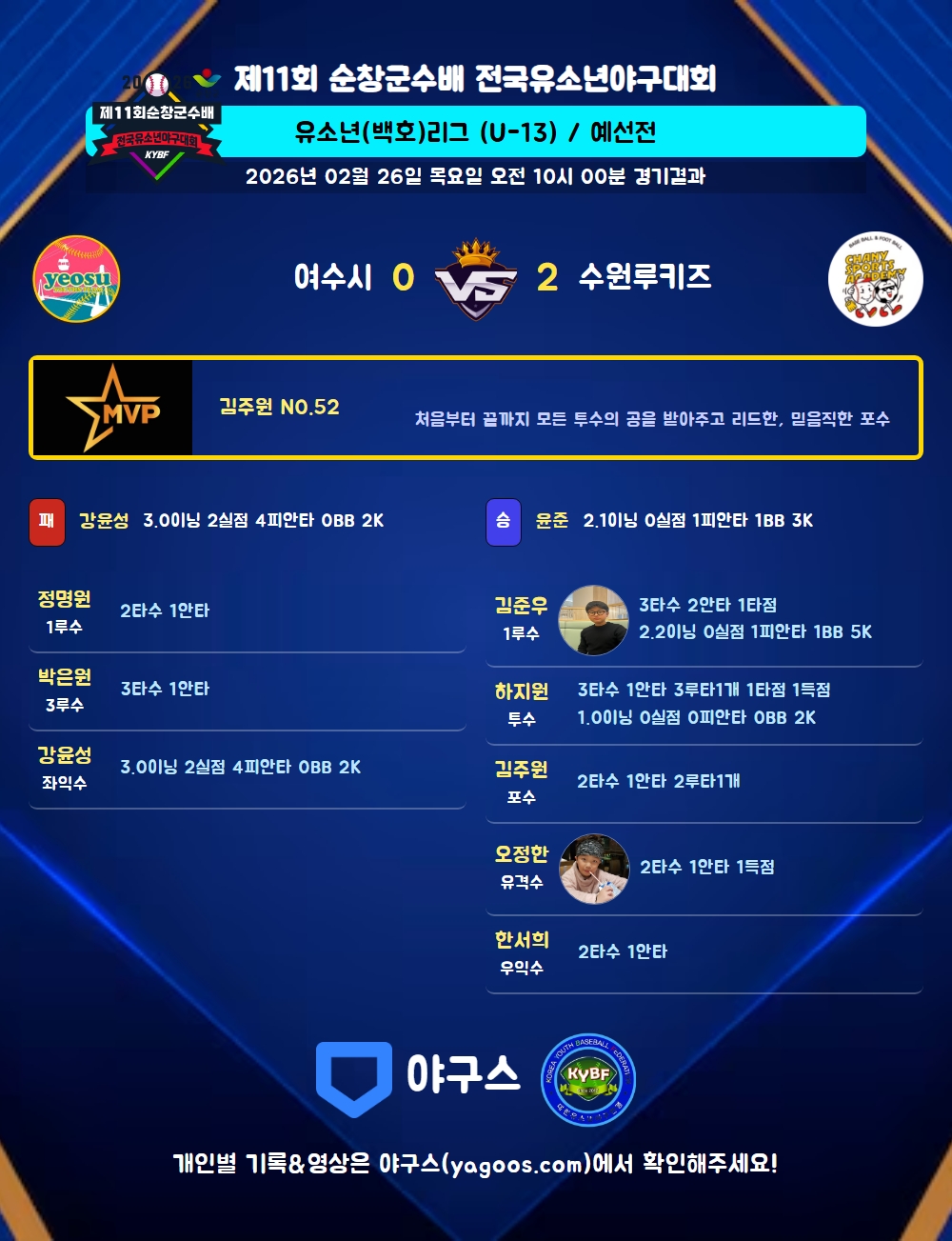 | 수원루키즈 | 2 | 0 | 0 | 0 | 0 | 0 | 2 | 6 | 0 | 2 | 5 |