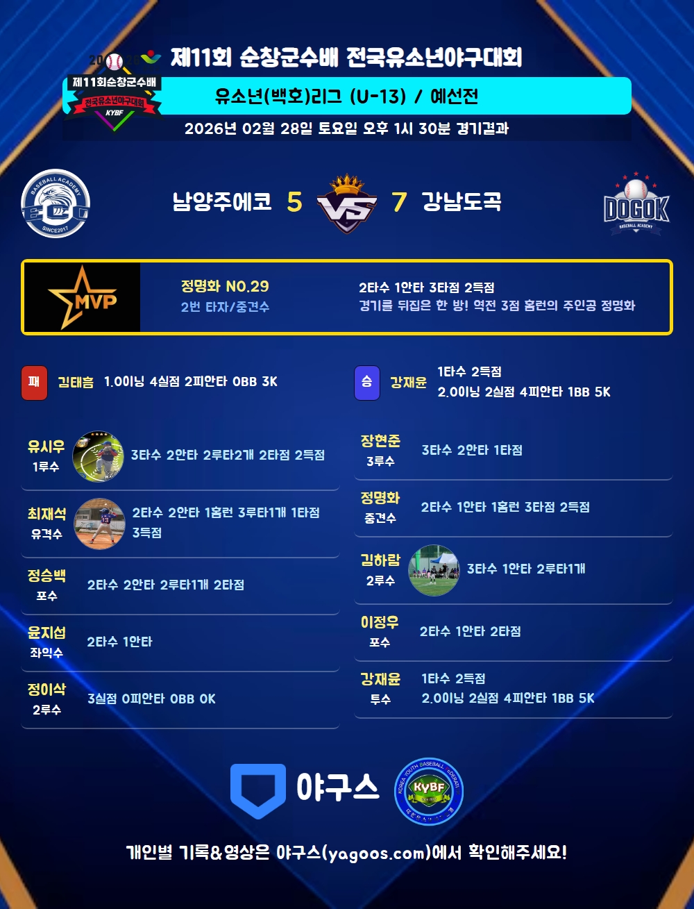 | 2루타 | 유시우(12) 정승백(11) 김하람(54) |