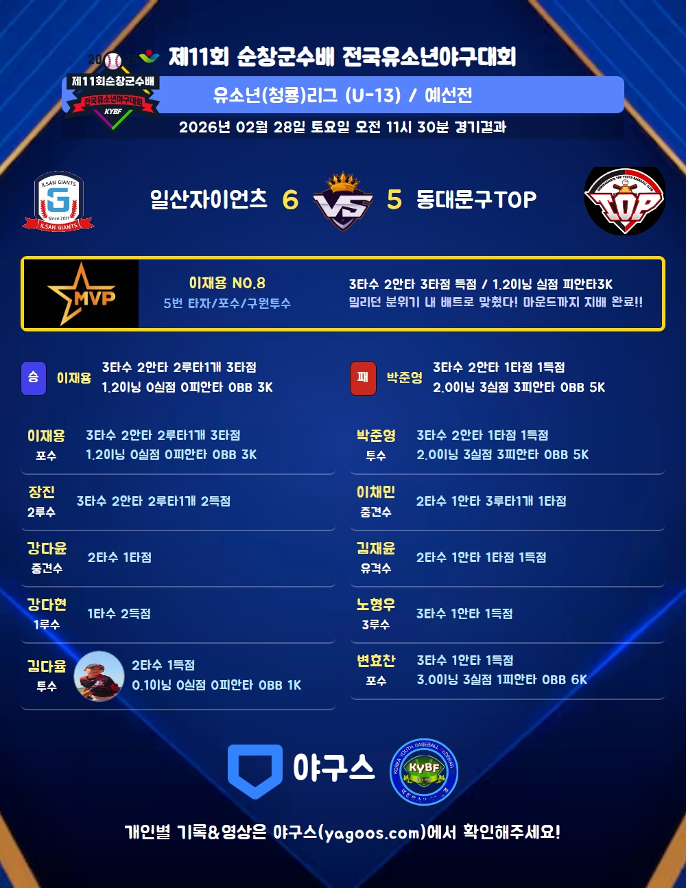 | 일산자이언츠 | 3 | 0 | 0 | 0 | 3 | 0 | 6 | 4 | 1 | 6 | 4 |
