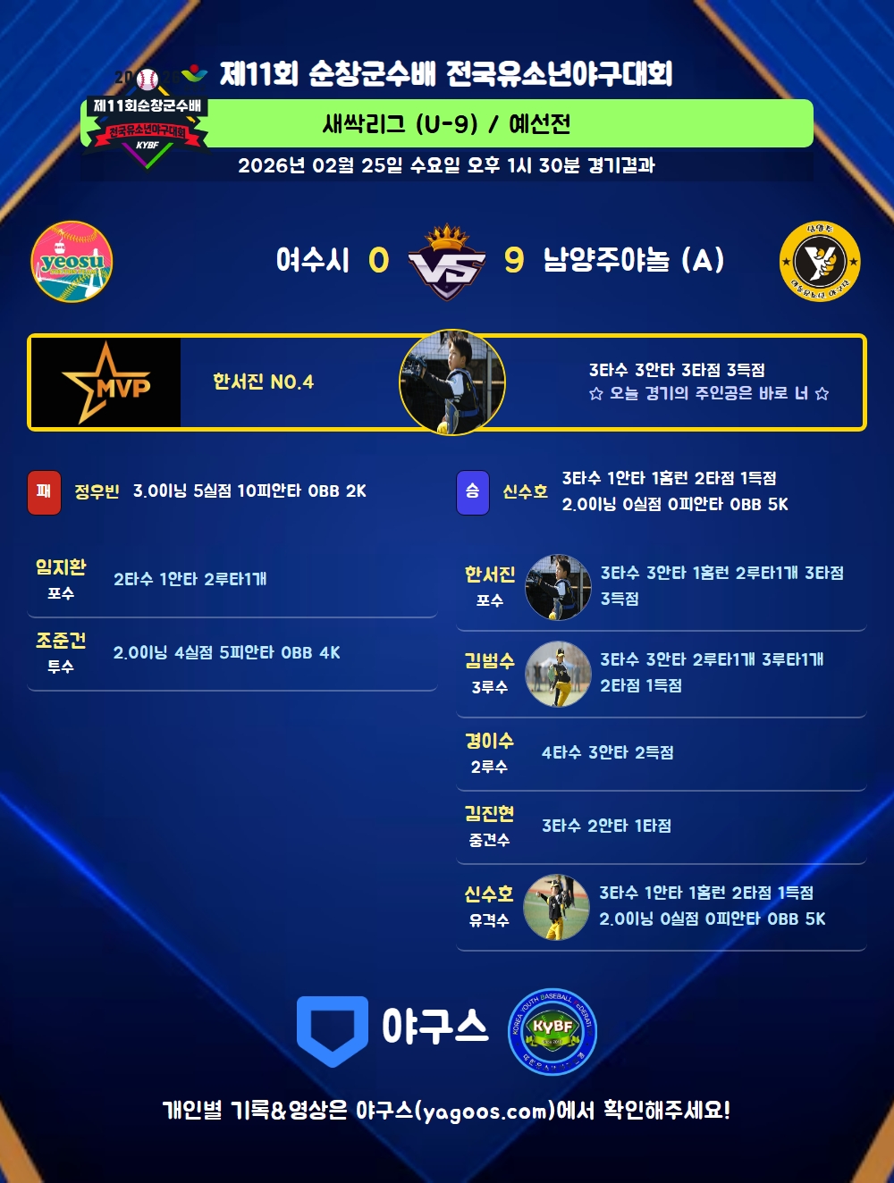 | 2루타 | 임지환(42) 송주완(10) 한서진(4) 김범수(32) 지우빈(39) |