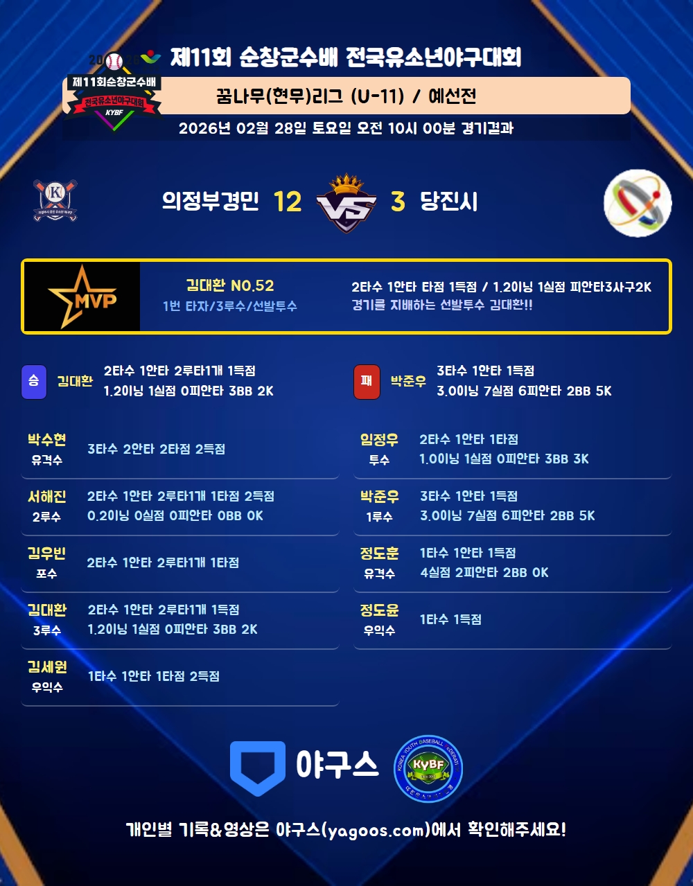 | 2루타 | 김대환(52) 서해진(5) 김우빈(64) |