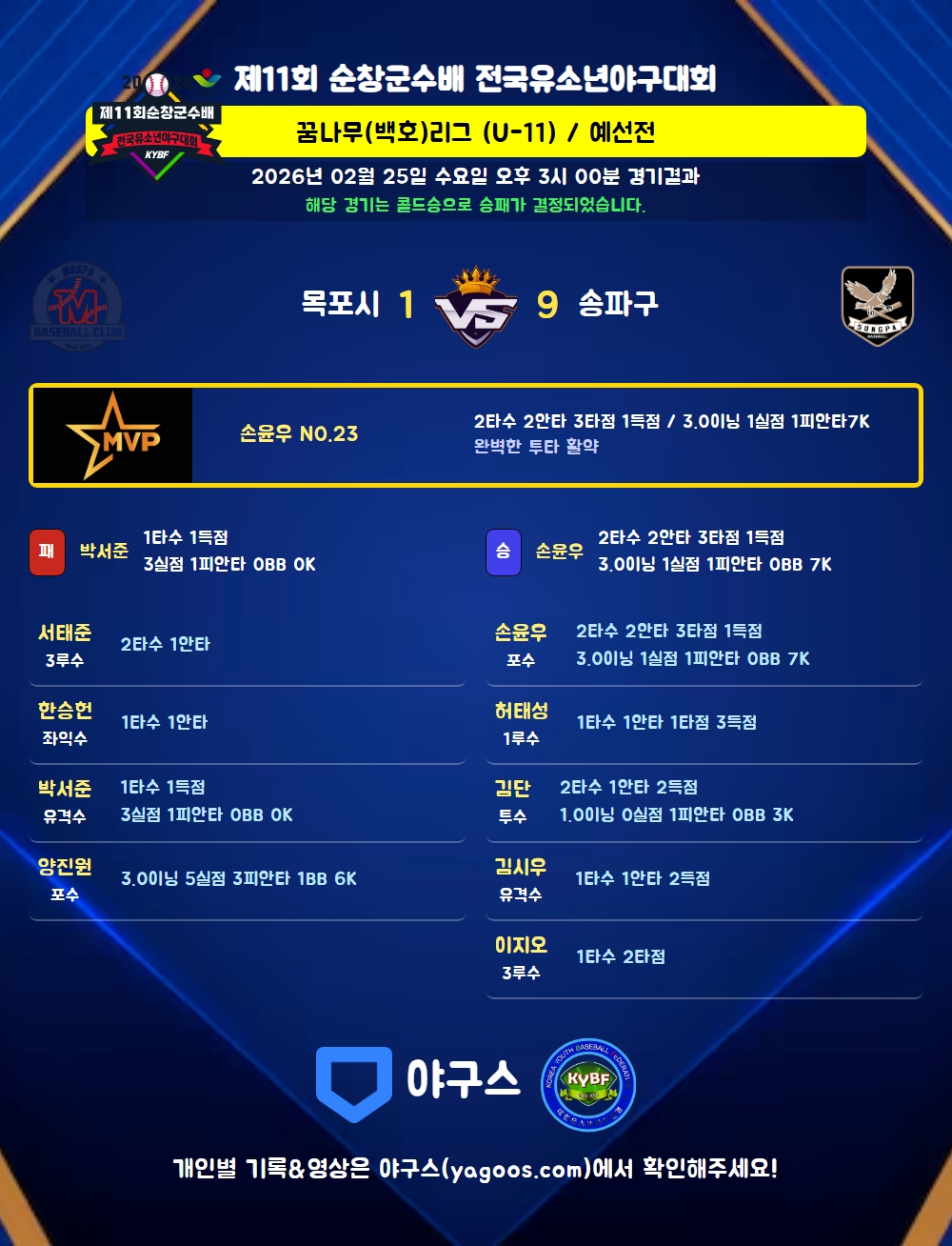 | 4 | 포 | 손윤우(23) | 우안(1타점) | 유내안(2타점) | - | 4구 | 2 | 2 | 3 | 1 | - | 3 | 1 | - | 1.000 |