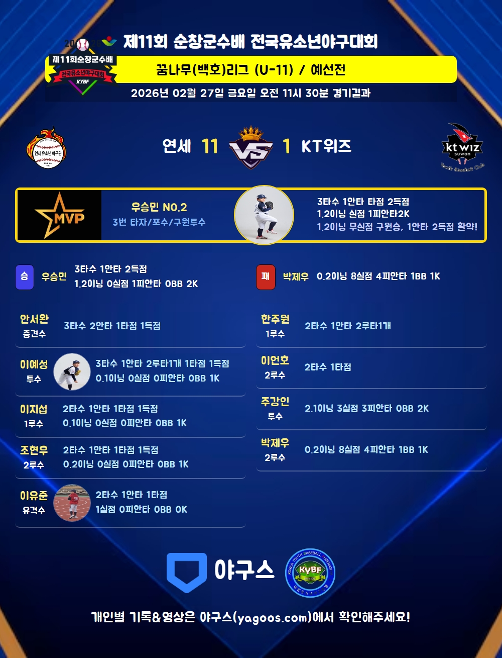 | 6 | 우 | 김태윤(11) | 사구 | 4구 | 1땅 | - | 1 | 0 | - | 1 | - | - | 2 | - | 0.000 |