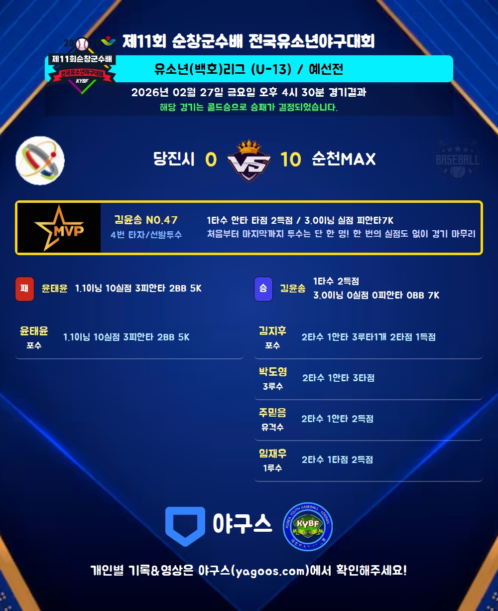 | 1 | 김윤송(47) | 승 | 3.0 | 10 | 9 | - | - | 1 | 7 | 48 | - | - | 0 |