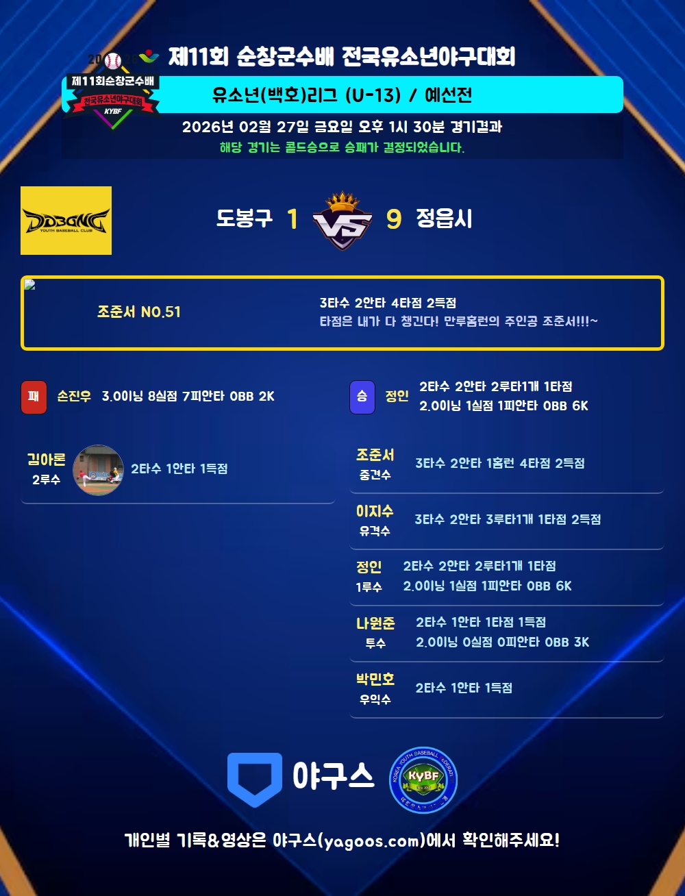 | 1 | 중 | 조준서(51) | 유내안 | 유실 | 우월홈(4타점) | - | 3 | 2 | 4 | 2 | 1 | 2 | - | - | 0.667 |