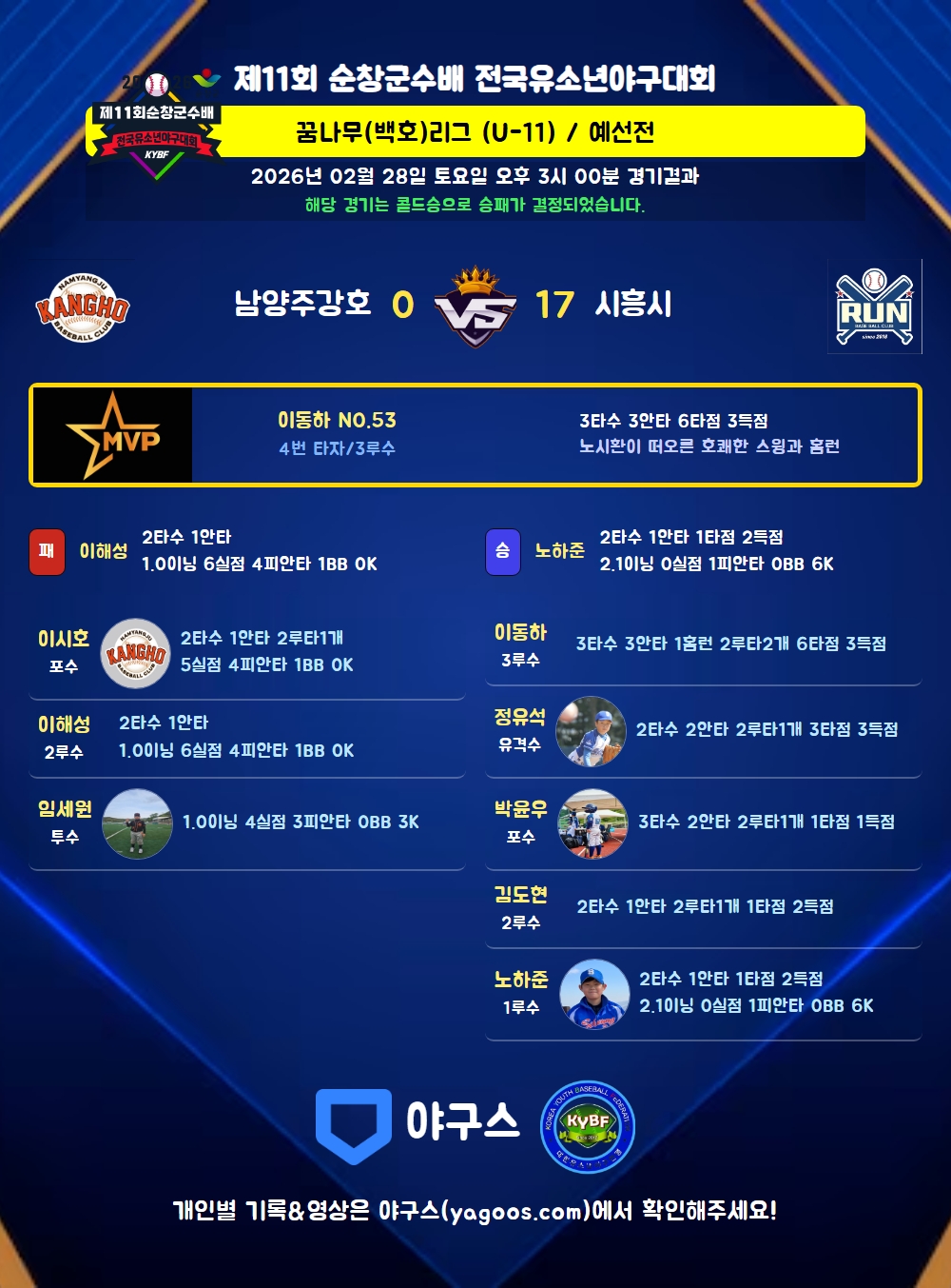 | 2루타 | 이시호(36) 김도현(3) 정유석(15) 이동하(53) 박윤우(51) |