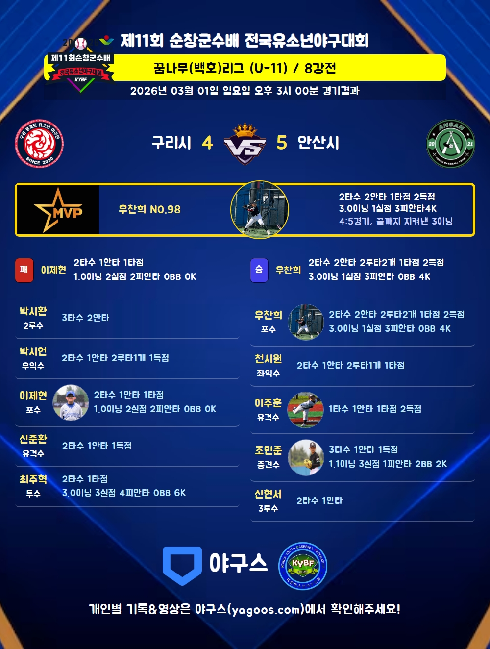 | 2루타 | 박시언(6) 우찬희(98) 천시원(17) |