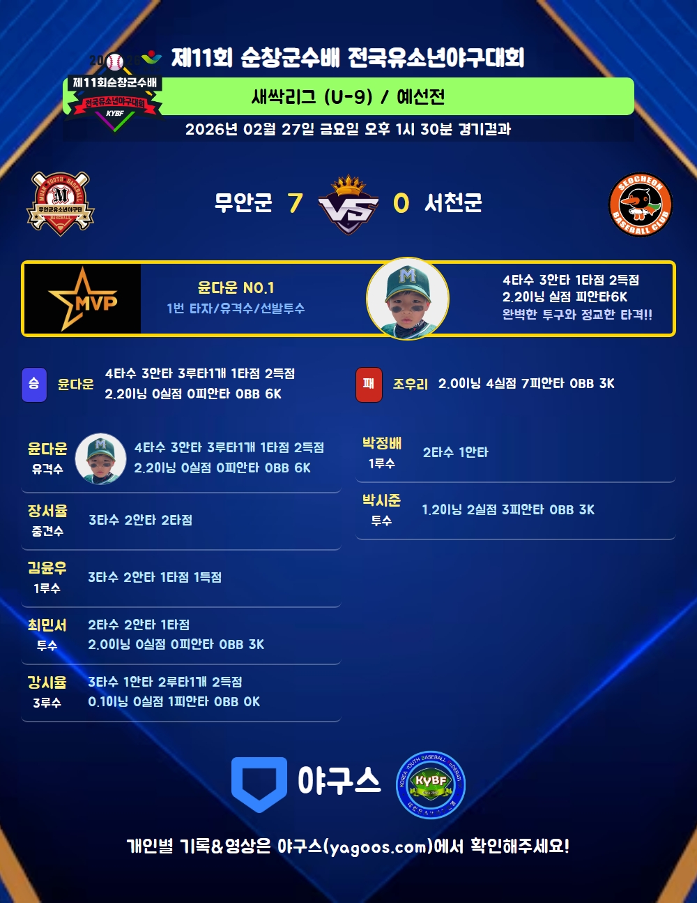 | 4 | 一 | 김윤우(7) | 3내안(1타점) | 3플 | - | 3내안 | - | - | 3 | 2 | 1 | 1 | - | - | - | - | 0.667 |