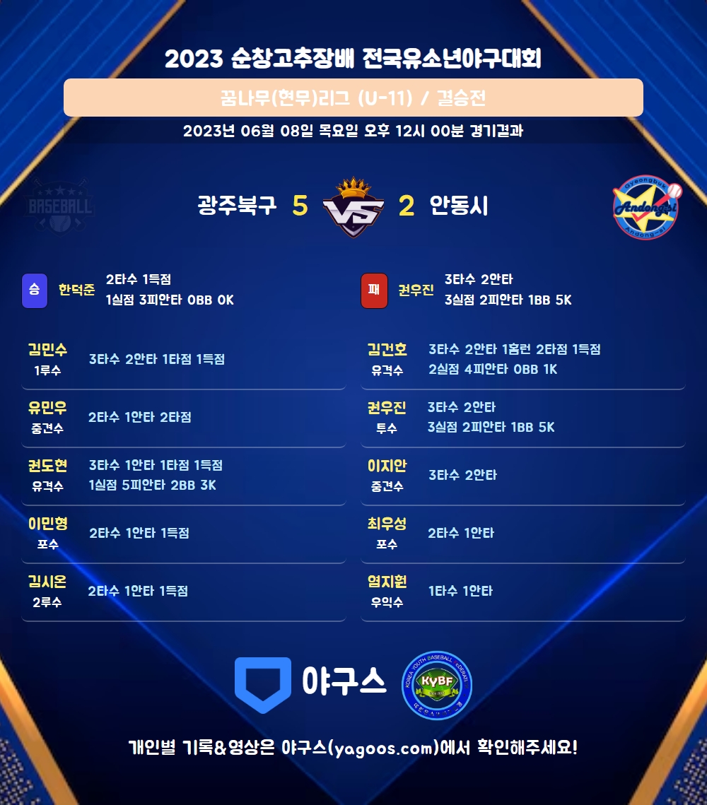 | 2 | 유 | 권도현(9) | 3내안 | - | 삼진 | - | 2땅 | 3 | 1 | 1 | 1 | 0 | 0 | - | 1 | 0.333 |
