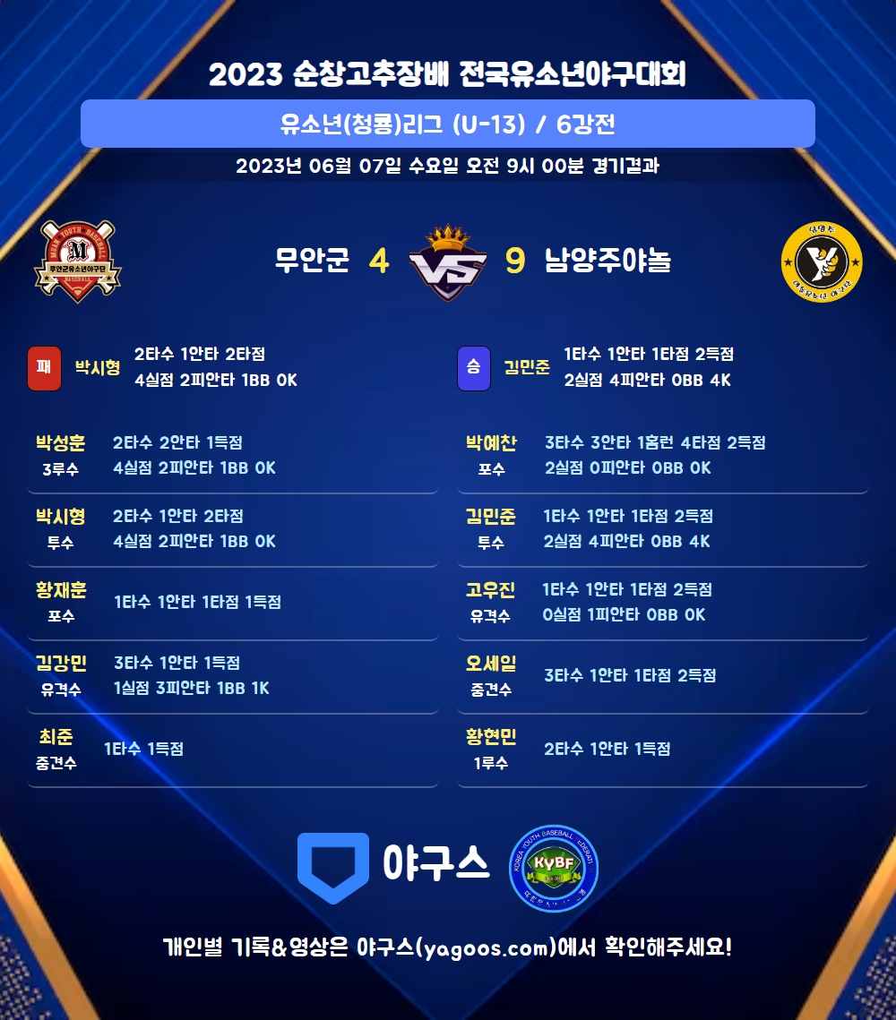 | 9 | 우 | 김태윤(13) | - | 투땅 | - | 유땅 | 2 | 0 | 0 | 0 | 0 | 0 | - | 0 | 0.000 |
