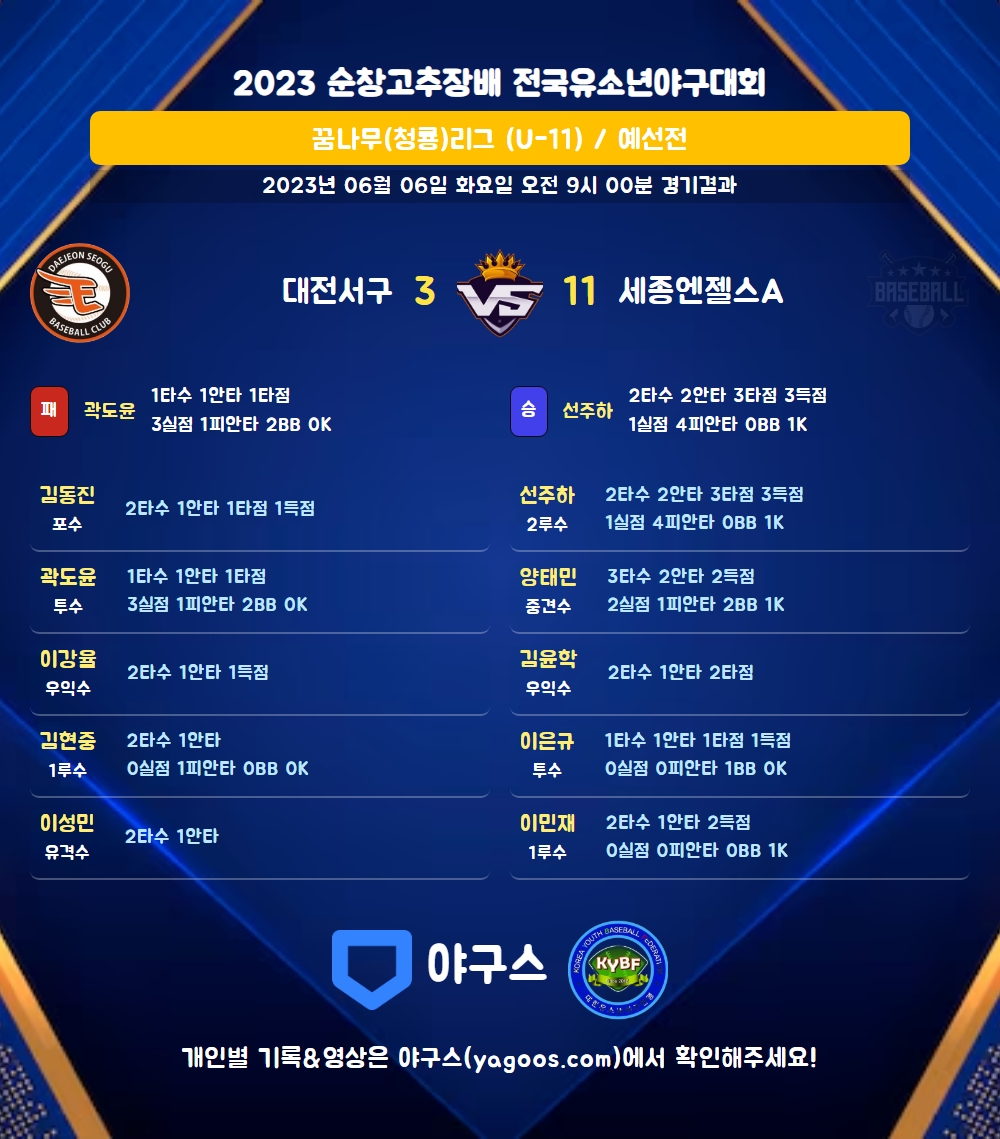 | 5 | 二 | 선주하(11) | 사구 | - | 좌중3 | 좌중3 | 2 | 2 | 3 | 3 | 0 | 2 | 1 | 0 | 1.000 |