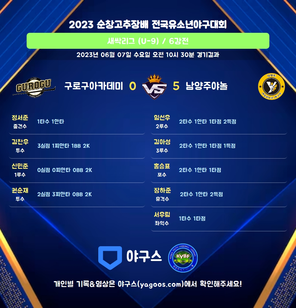| 남양주야놀 | 3 | 2 | 0 | 5 | 4 | 1 | 7 |