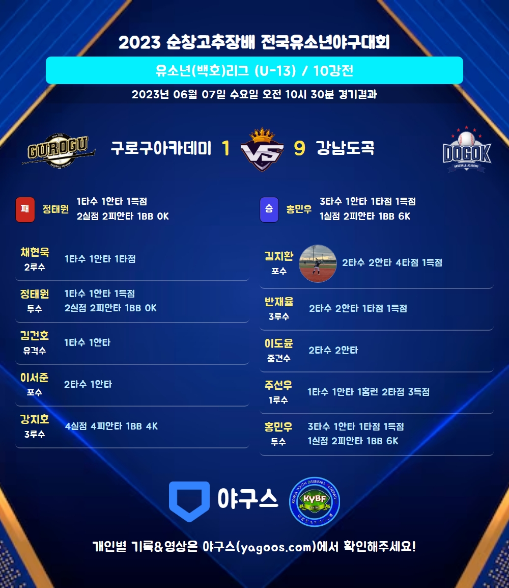 | 1 | 홍민우(60) | 승 | - | 11 | 2 | 2 | 0 | 3 | 6 | 45 | 1 | 1 | 0 |