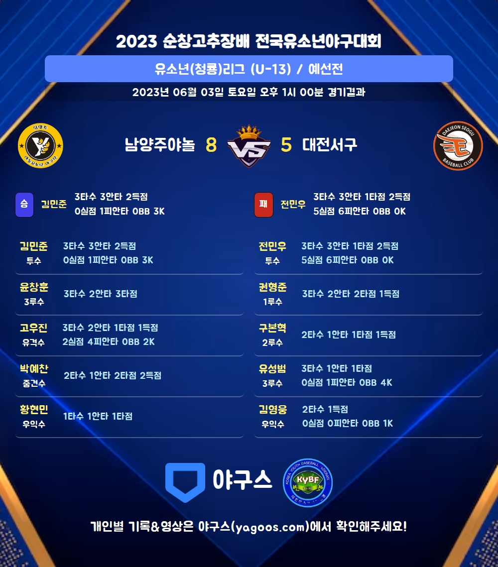 | 5 | 포 | 마준민(29) | - | 삼진 | - | 유플 | - | 2 | 0 | 0 | 0 | 0 | 0 | - | 1 | 0.000 |